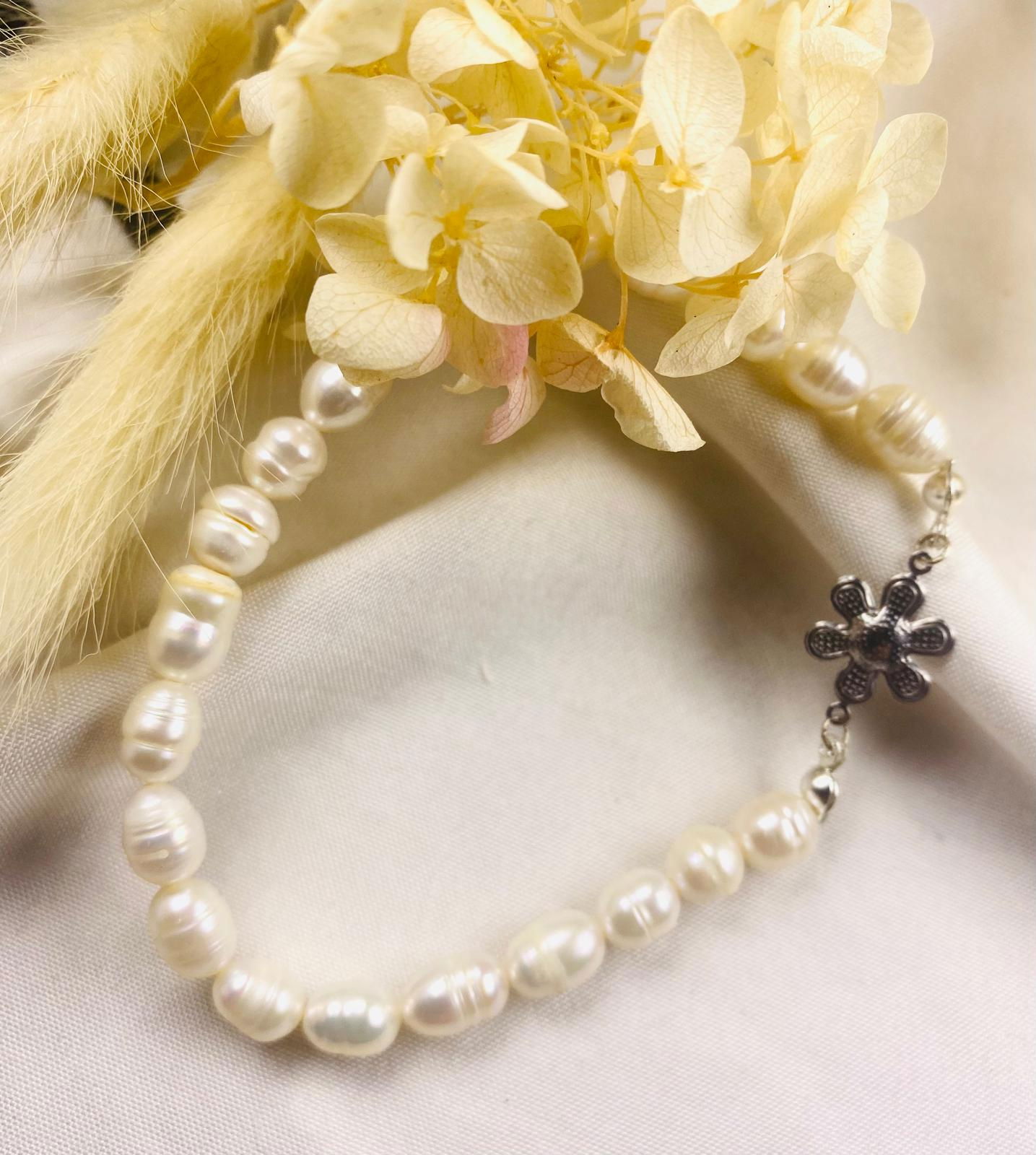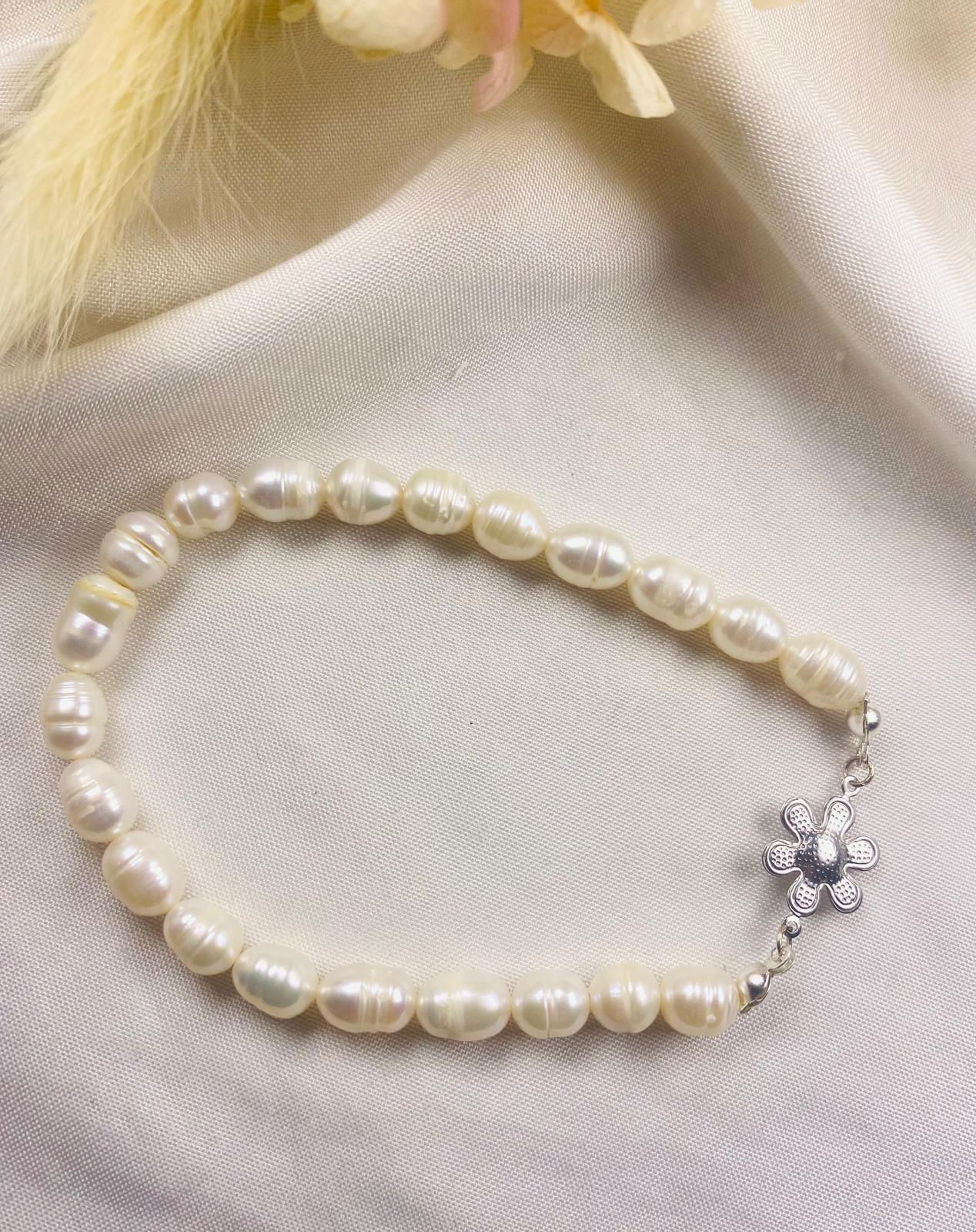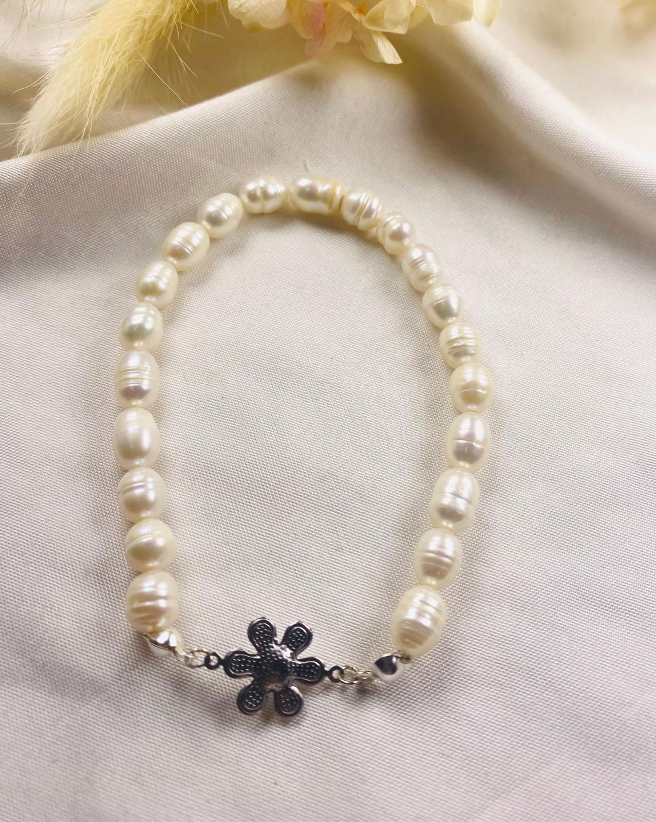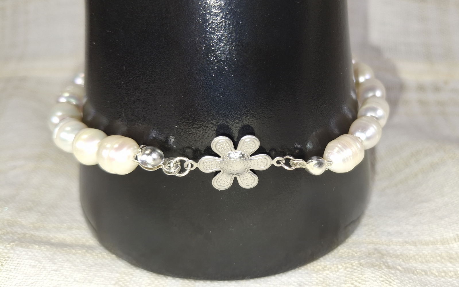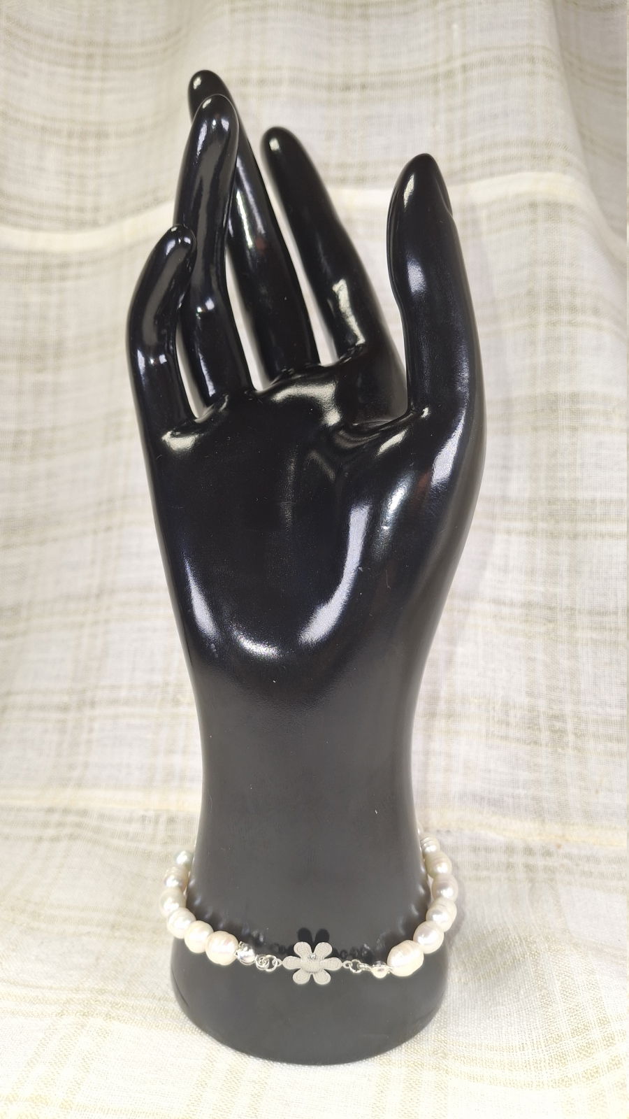 Descriere: Bratara din perle de cultura albe, pe baza elastica, cu accesorii argintii din otel inoxidabil. Greutate: 9,40 grame