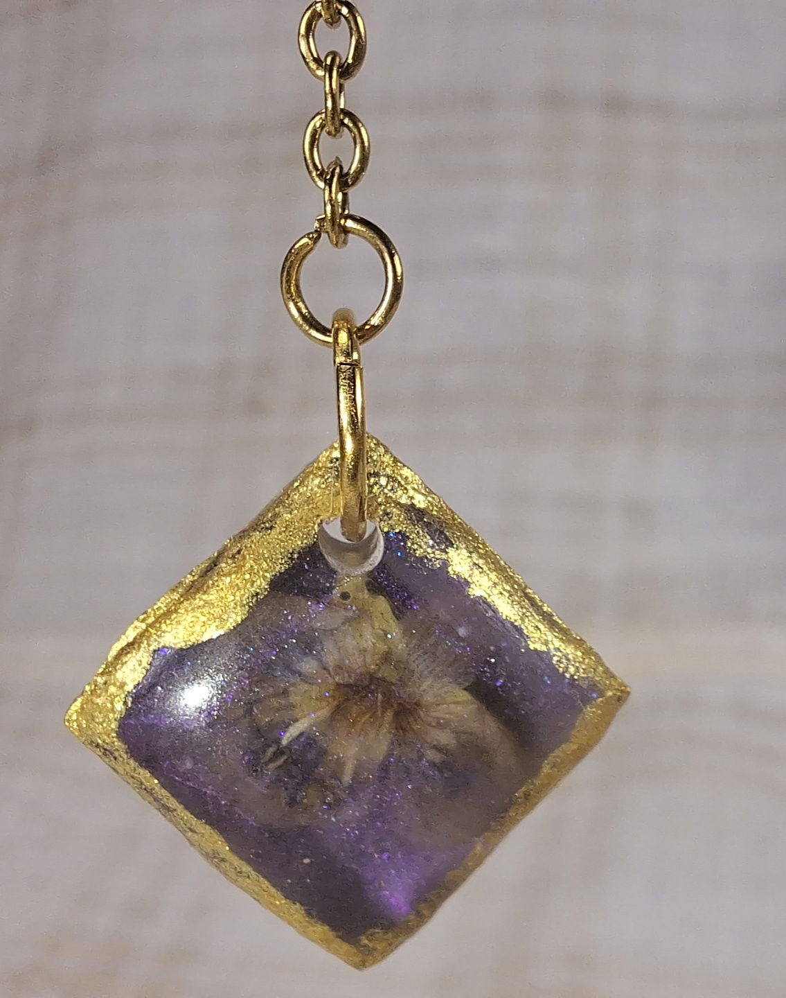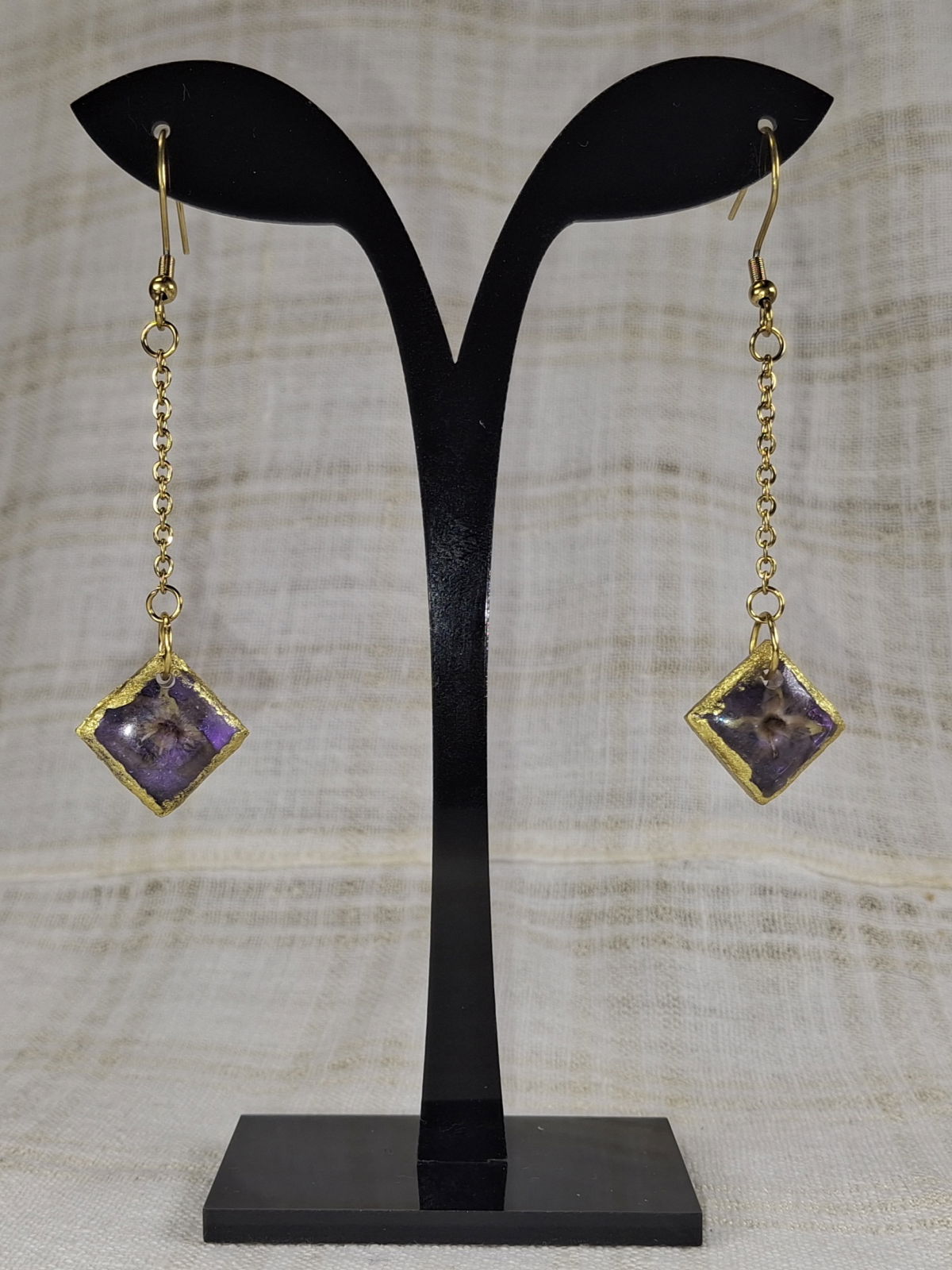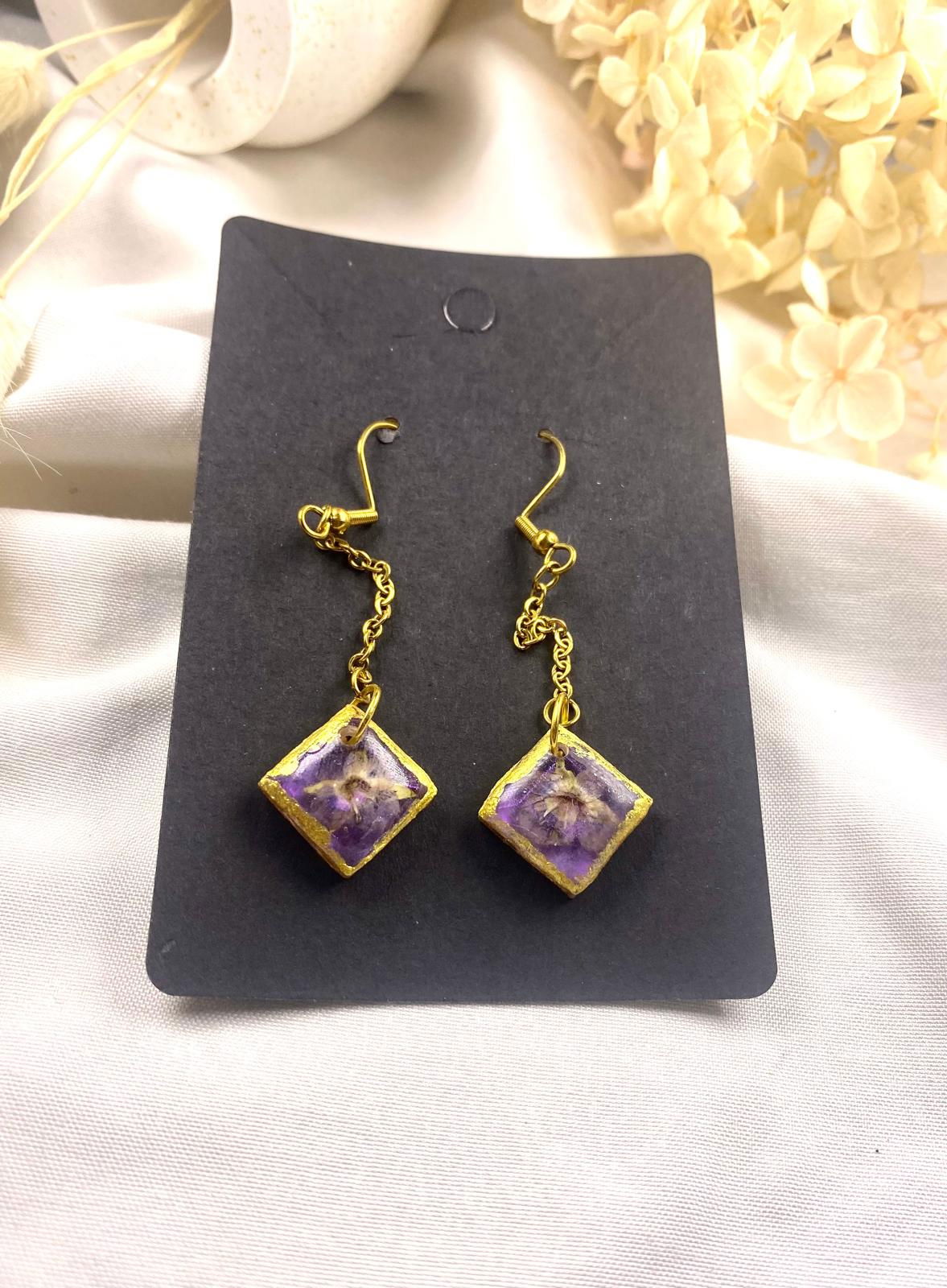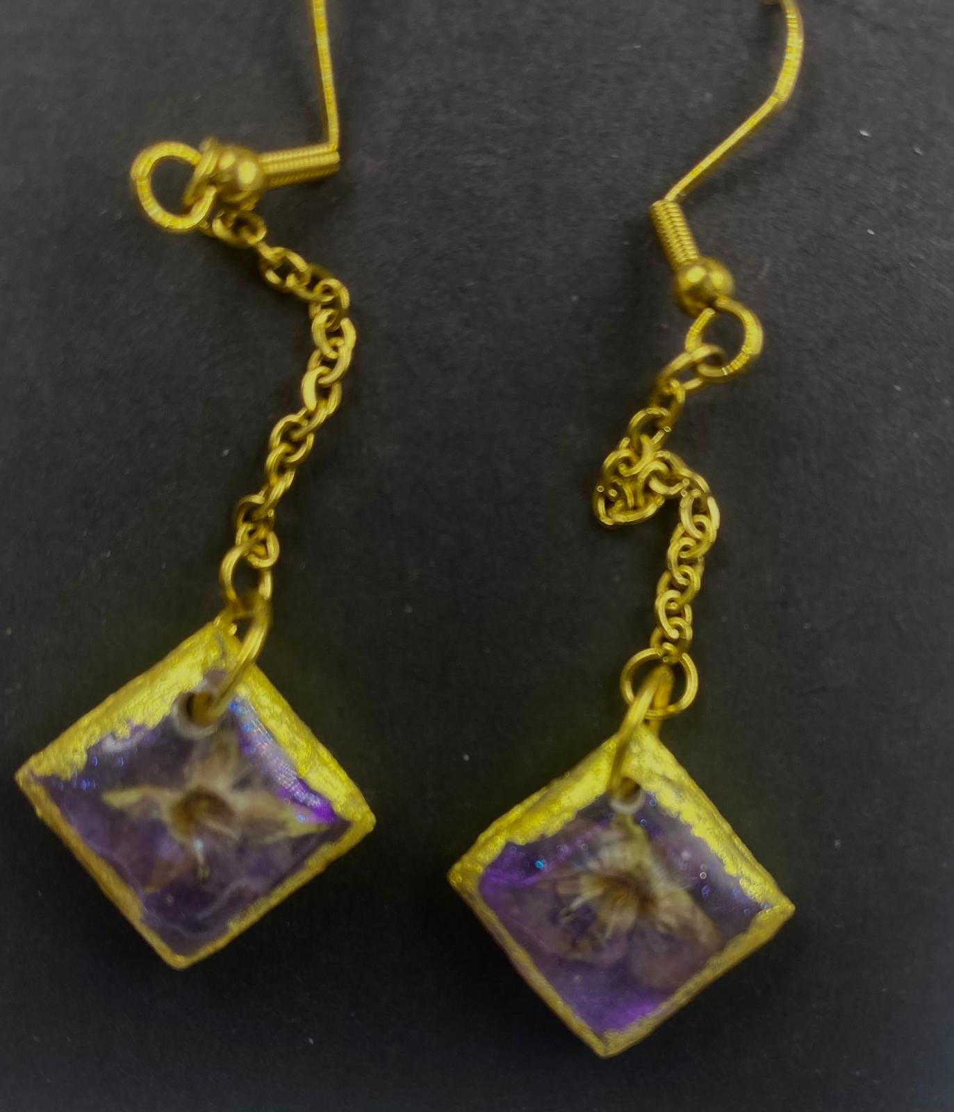 Descriere: cercei din rasina decorata cu floricele de miozotis naturale. Accesorii aurii. Lungime: 6 cm, greutate: 1,21 grame.