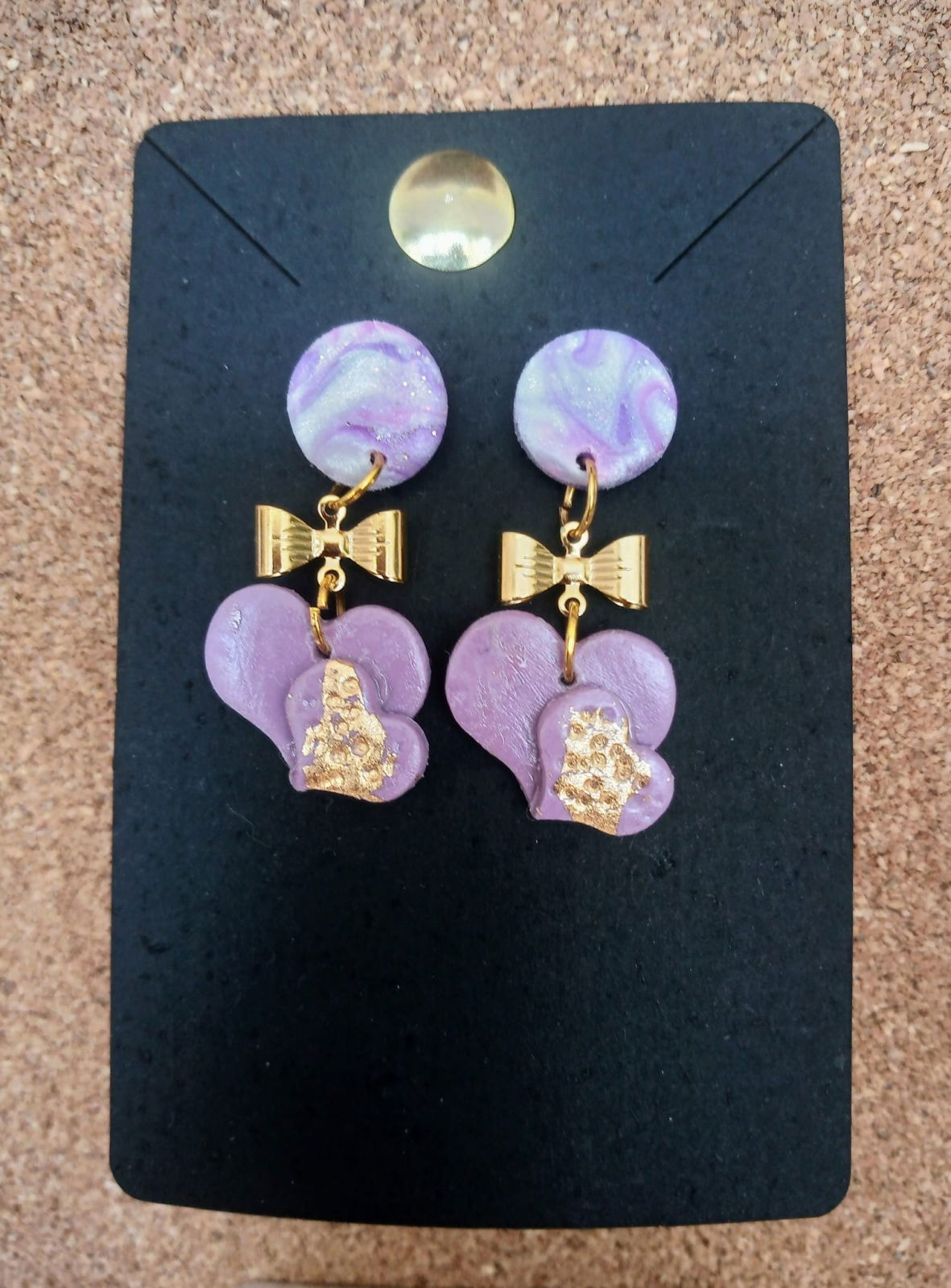 Cercei realizati manual din lut polimeric, inimioare mov cu fundite aurii din otel inoxidabil.