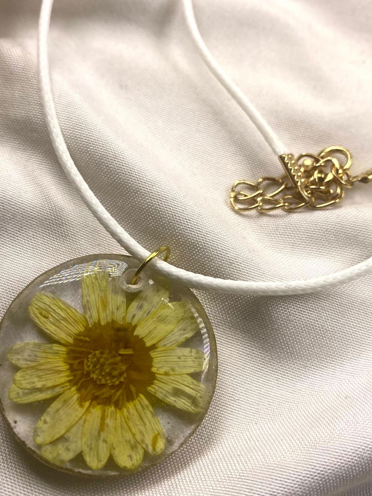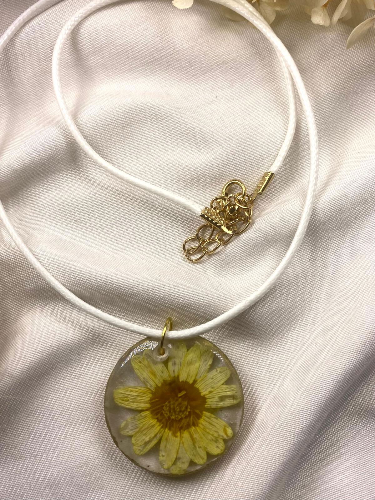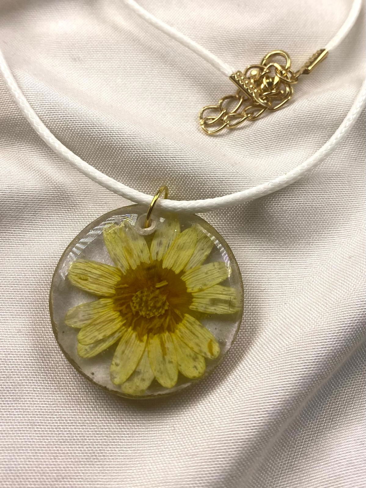 Descriere: snur alb, ceruit, cu pandantiv rotund, din rasina decorata cu flori naturale de galbenele. Lungime: 45 cm.