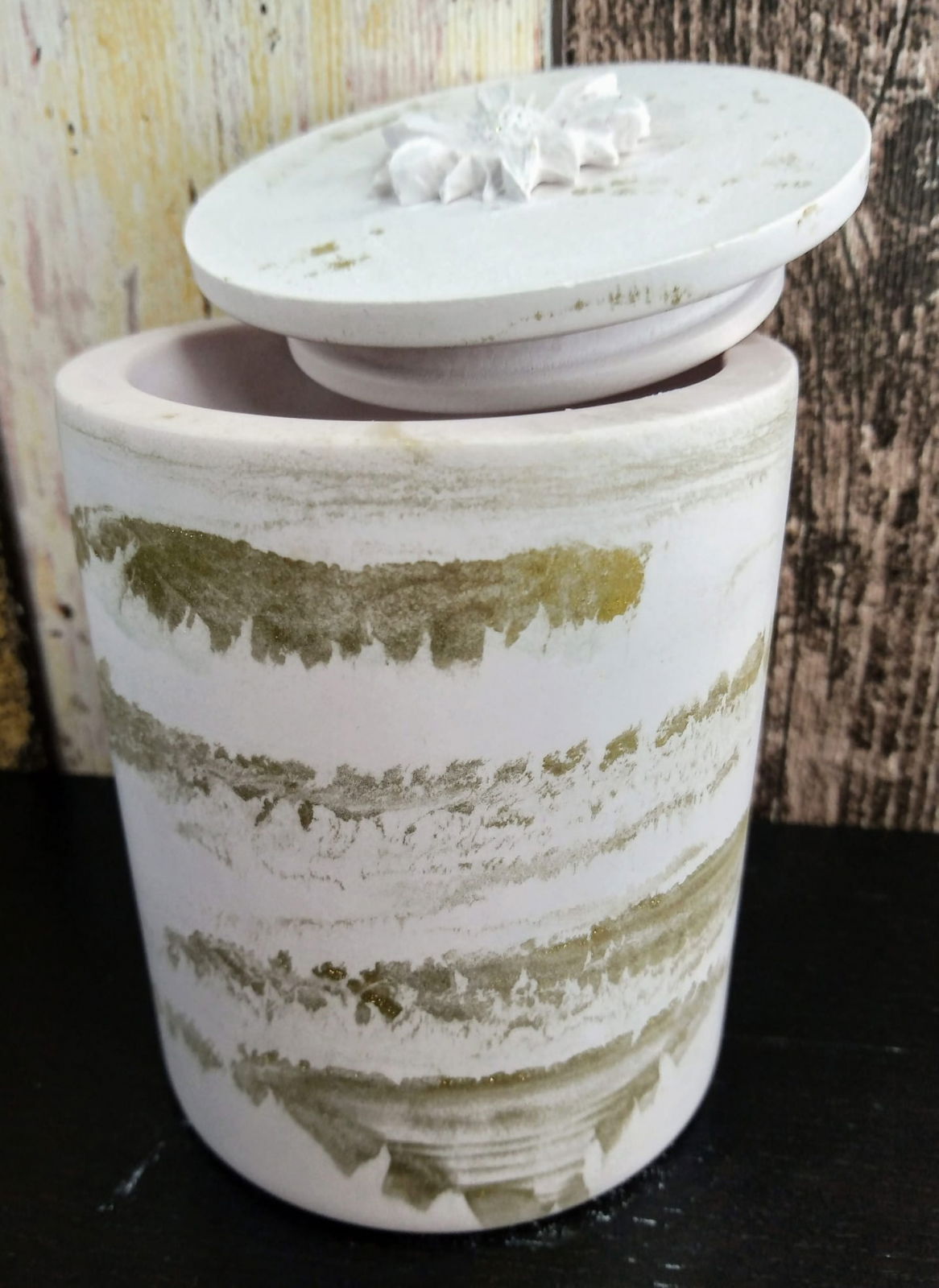 Recipient rotund din ceramica cu capac - produs in atelierul nostru, handmade, cu multiple destinatii: suport lumanari, suport creioane/pensule machiaj, decor, suport aranjamente florale, ghiveci plante mici.