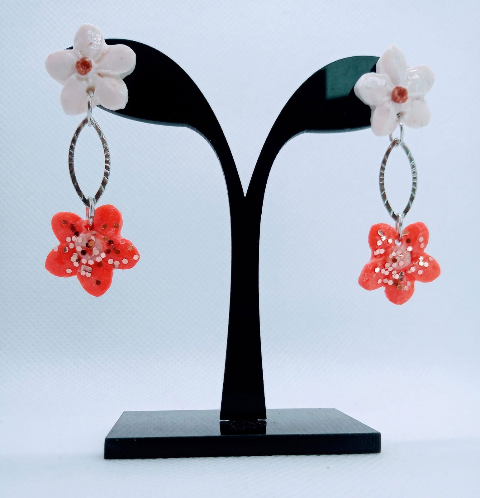 Cercei realizati manual din lut polimeric, floricele alb/roz, cu accesorii argintii din otel inoxidabil.