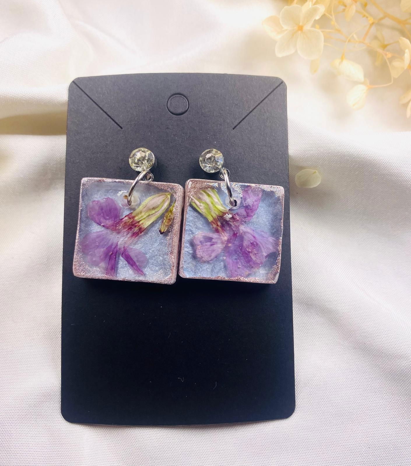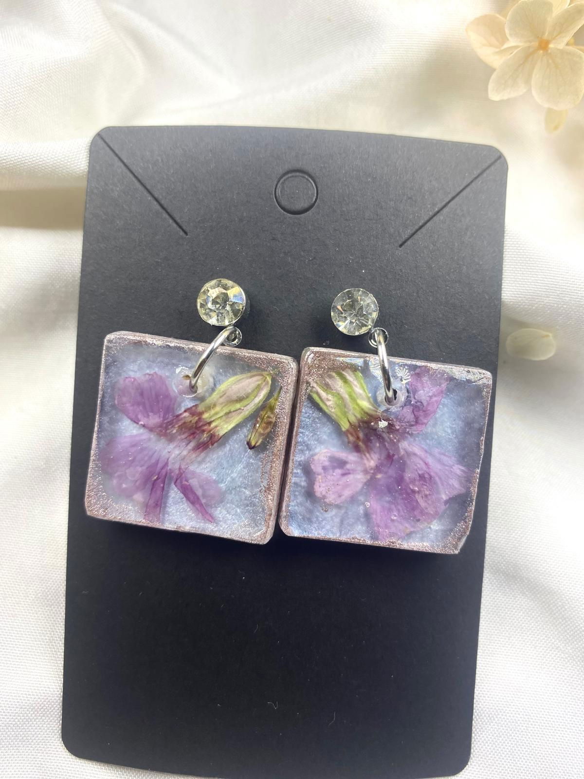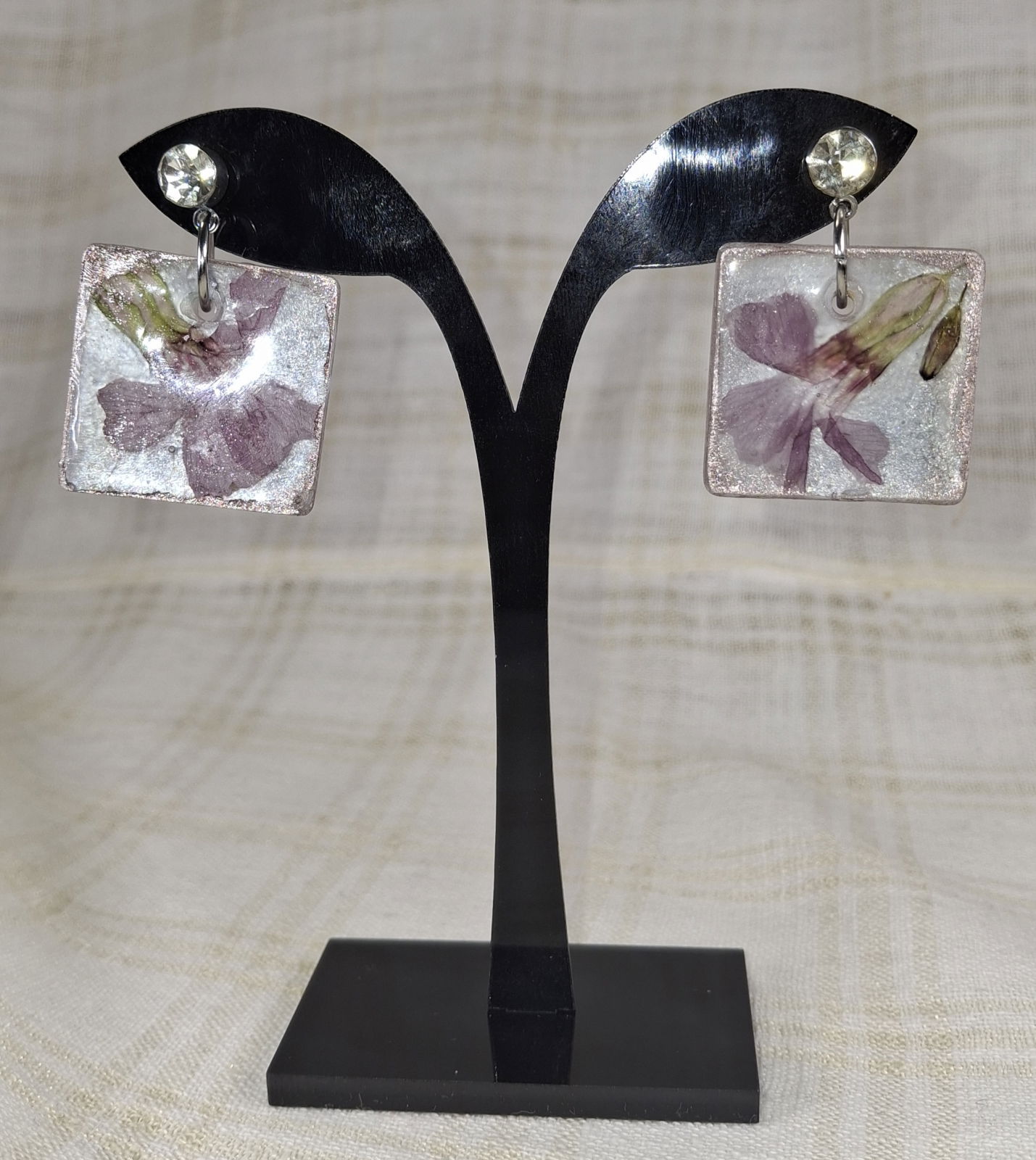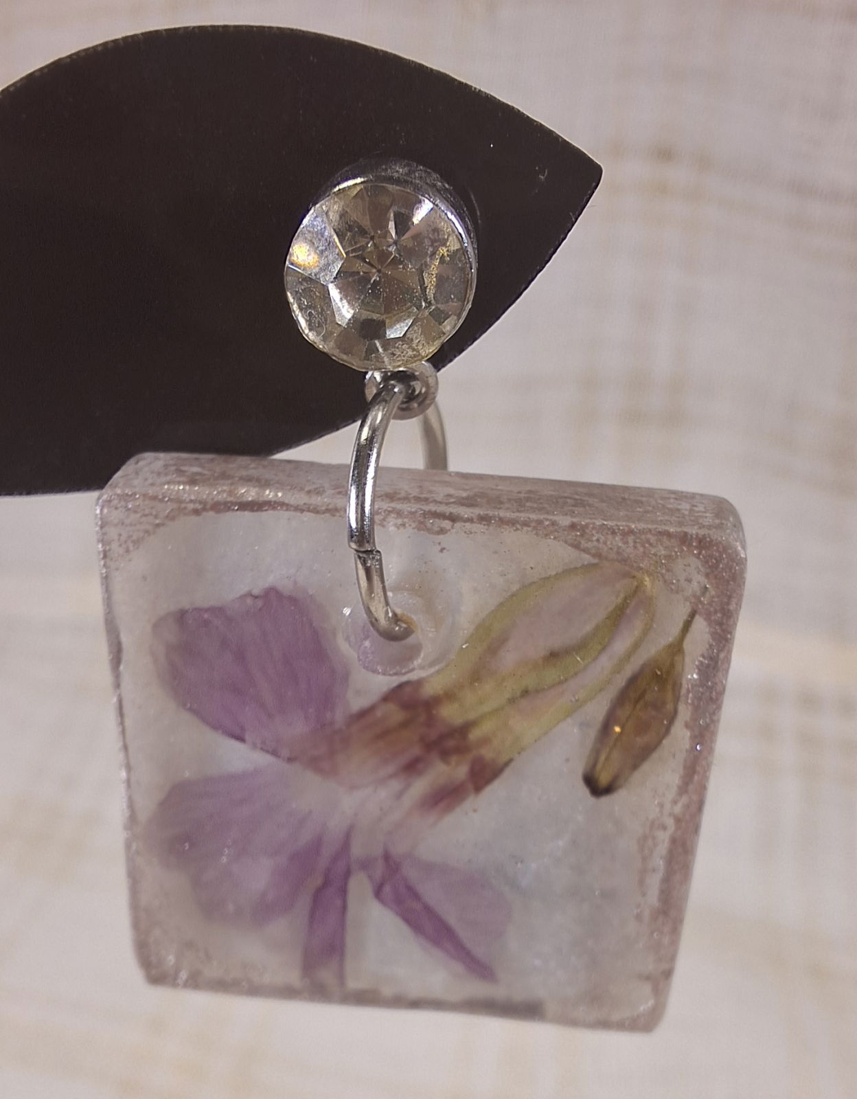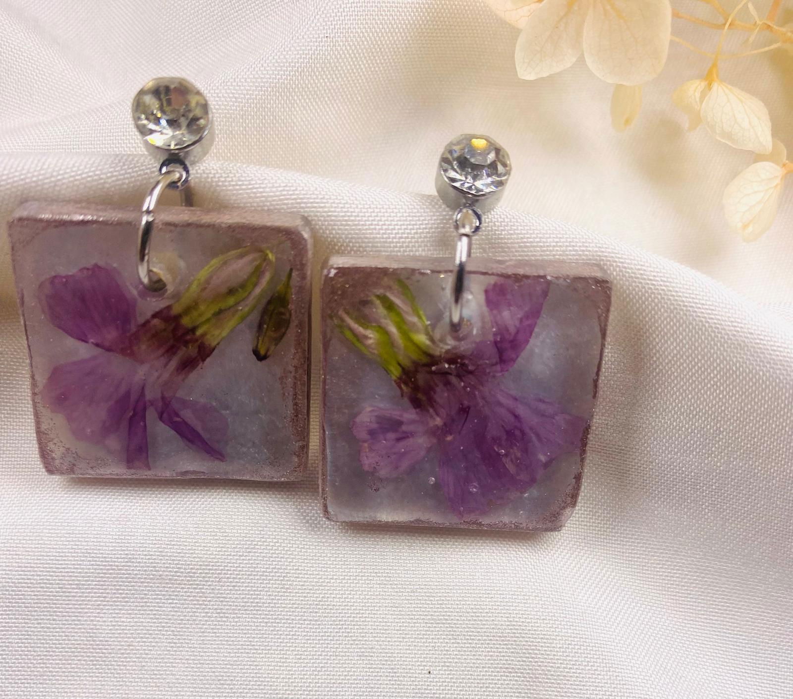 Descriere: cercei patrati din rasina decorati cu flori natural, uscate, mov. Accesorii argintii din otel inoxidabil. Latura patratului: 2 cm, greutate: 4,8 grame.