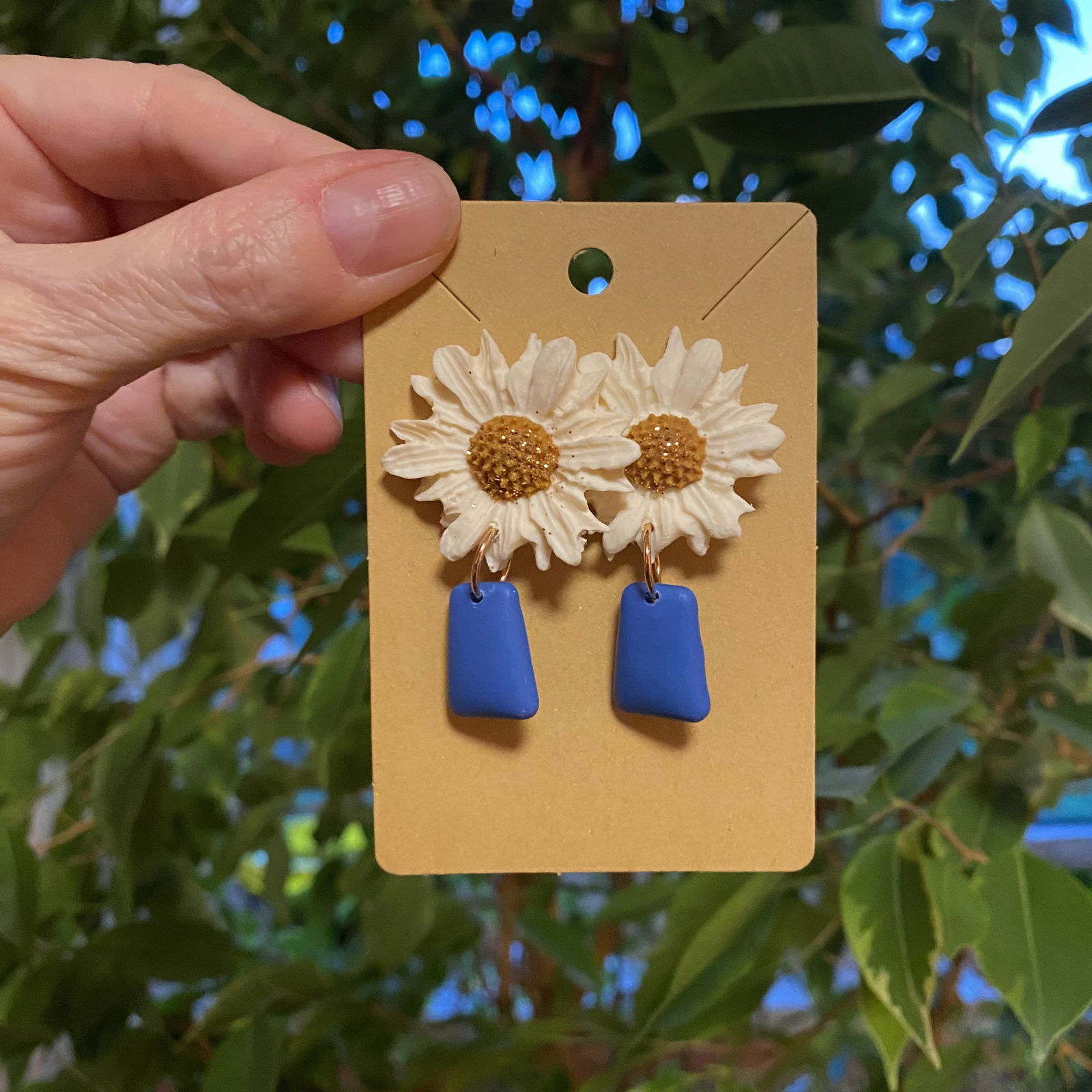 Cercei realizati manual din lut polimeric, model floral, alb - albastru, cu accesorii din otel inoxidabil.