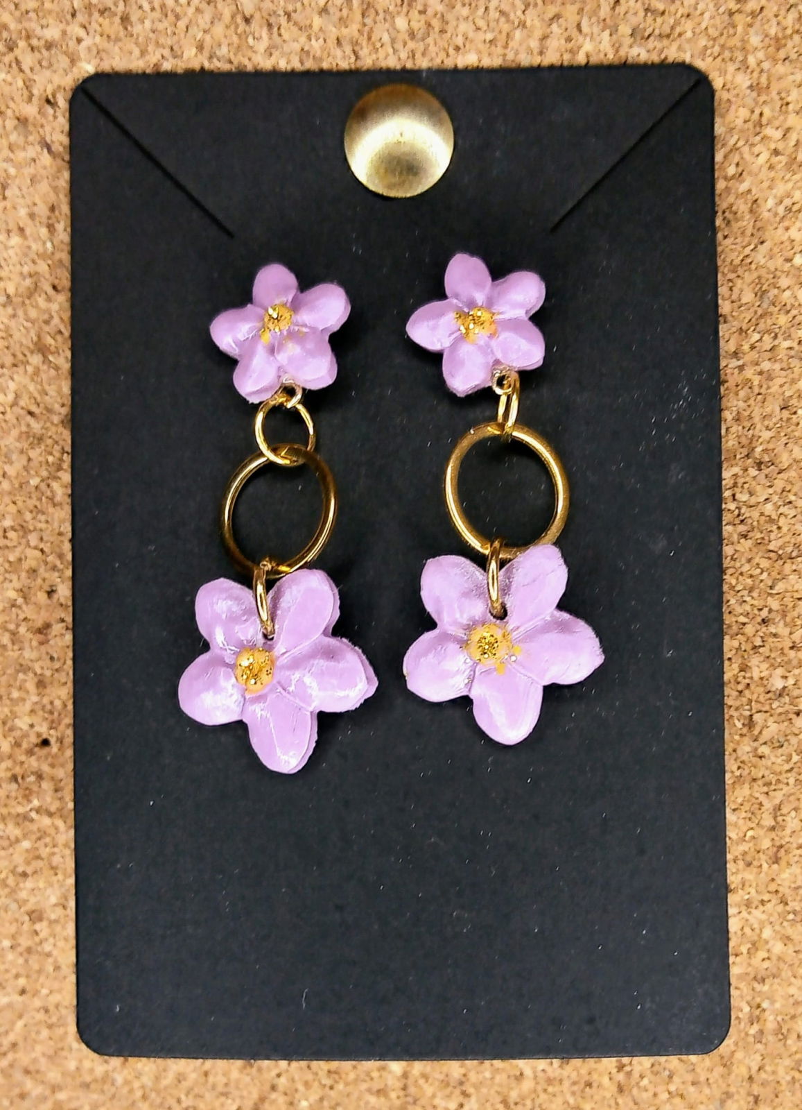 Cercei realizati manual din lut polimeric, floricele mov cu accesorii aurii din otel inoxidabil.