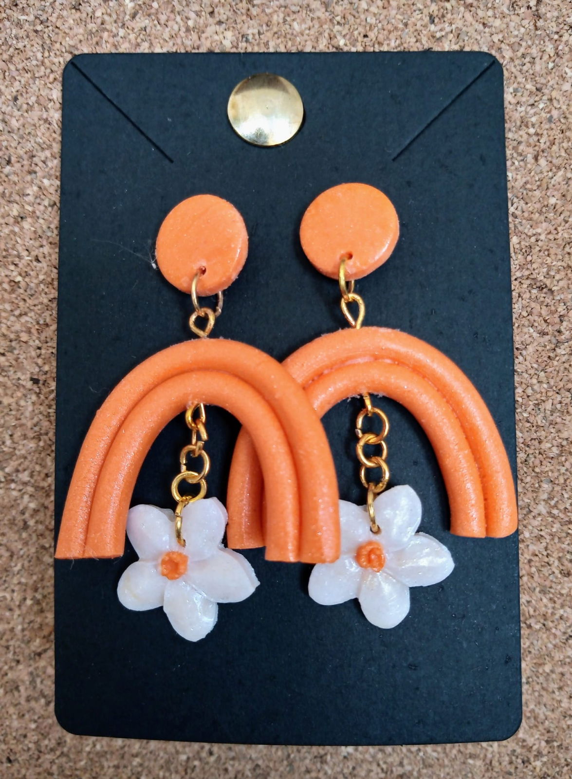 Cercei realizati manual din lut polimeric, portocalii cu floricele albe, cu accesorii aurii din metal de inalta calitate.