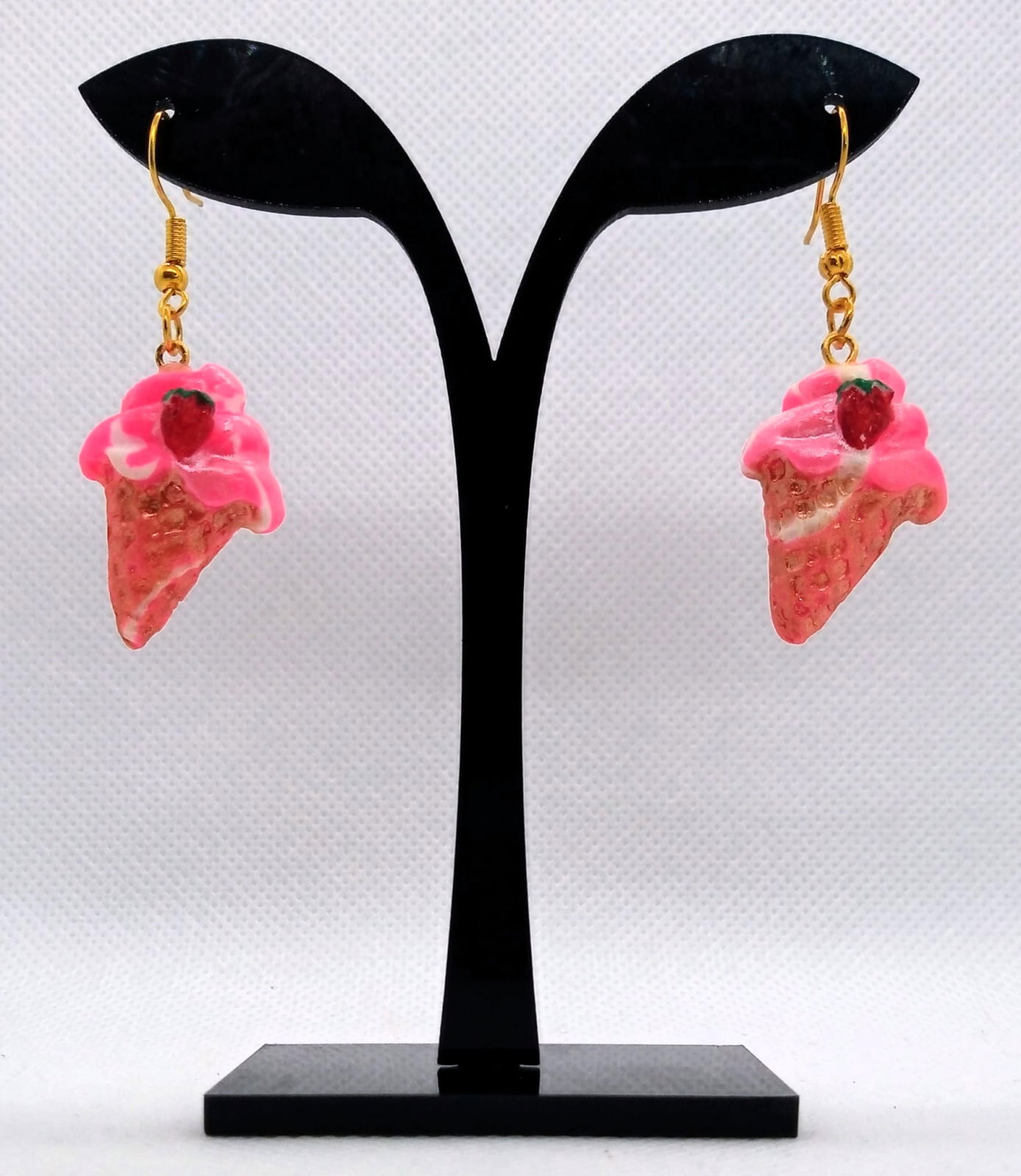Cercei realizati manual din lut polimeric, cornet de inghetata, roz, cu accesorii aurii din otel inoxidabil.