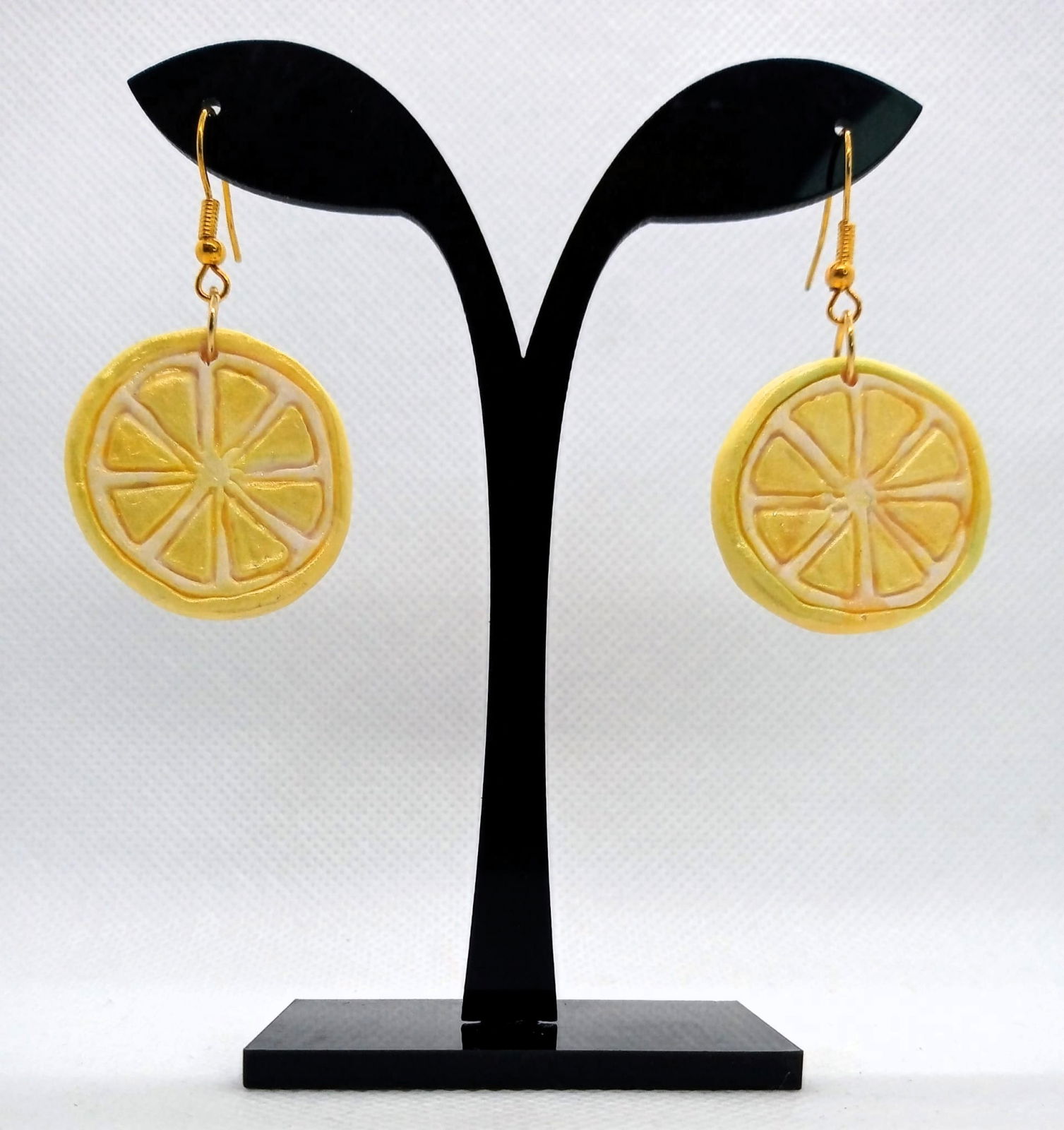 Cercei realizati manual din lut polimeric, felii de lamai galben pal cu accesorii aurii din otel inoxidabil.