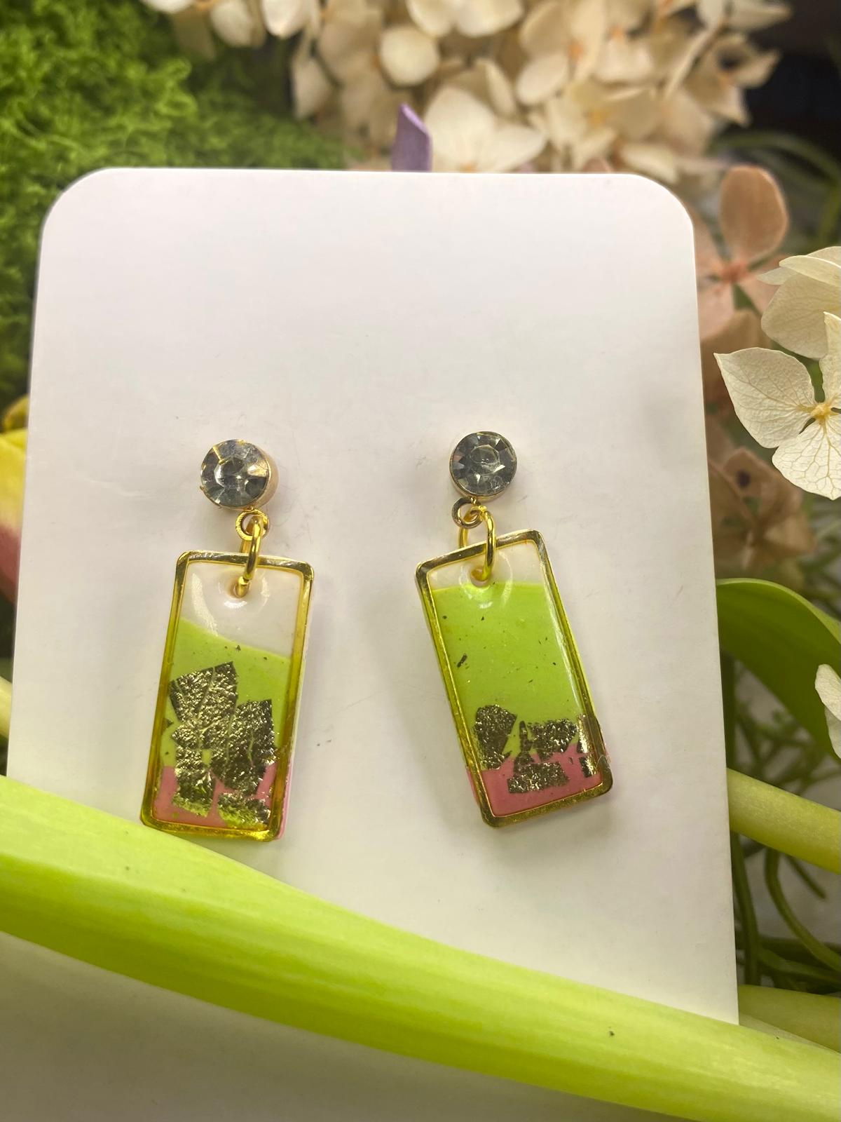 Rășina, un material ușor și versatil, este utilizată pentru a crea forme și texturi diverse, de la designuri simple și elegante, până la modele sofisticate, cu detalii fine. Datorită transparenței și proprietății sale de a fi ușor colorată, cerceii din rășină pot fi personalizați în nuanțe vibrante sau nuanțe pastelate, aducând un strop de culoare oricărei ținute. Uneori, rășina este combinată cu elemente precum flori presate, foi de aur, cristale mici sau pigmenti speciali ce filtreaza subtil lumina, adăugând un plus de rafinament și strălucire.