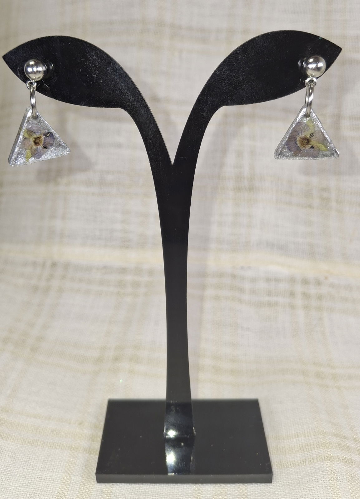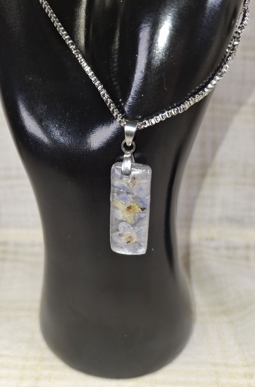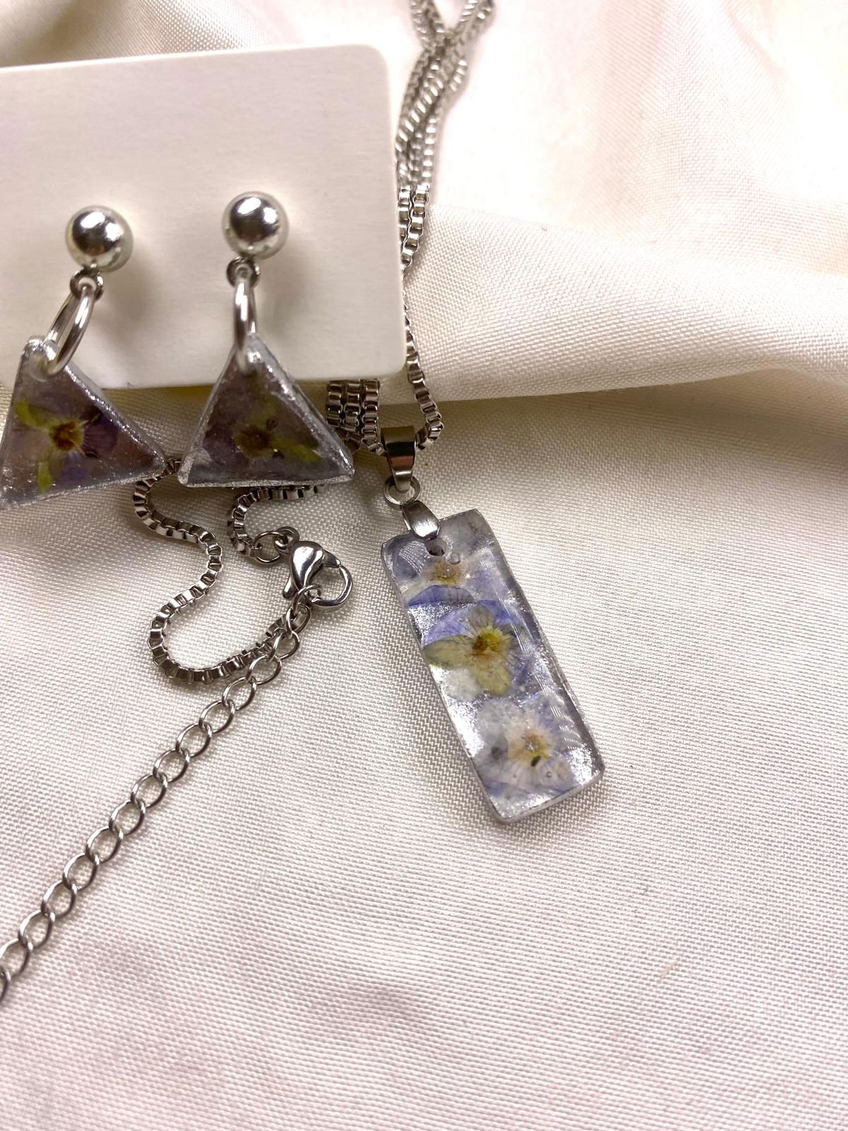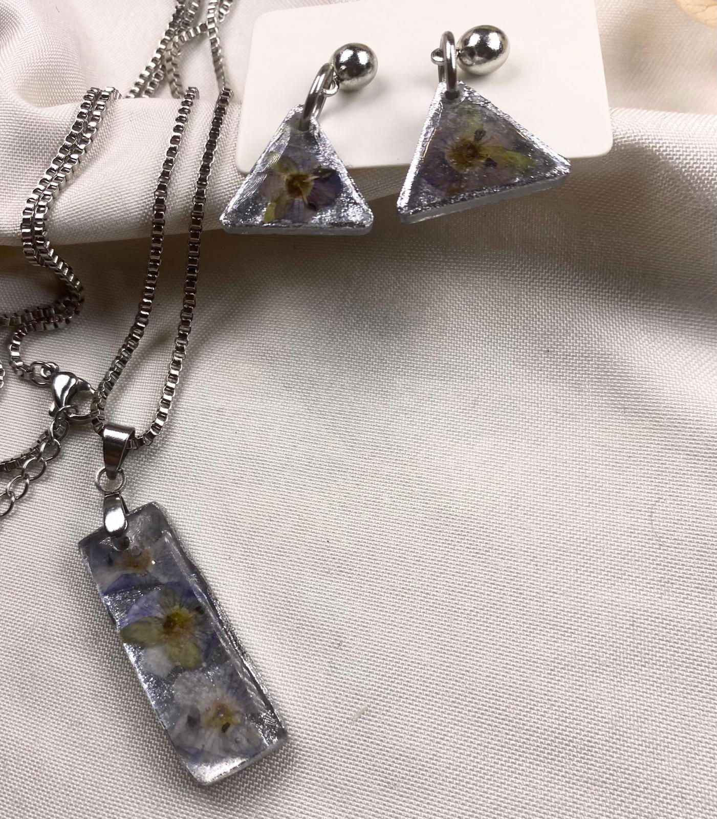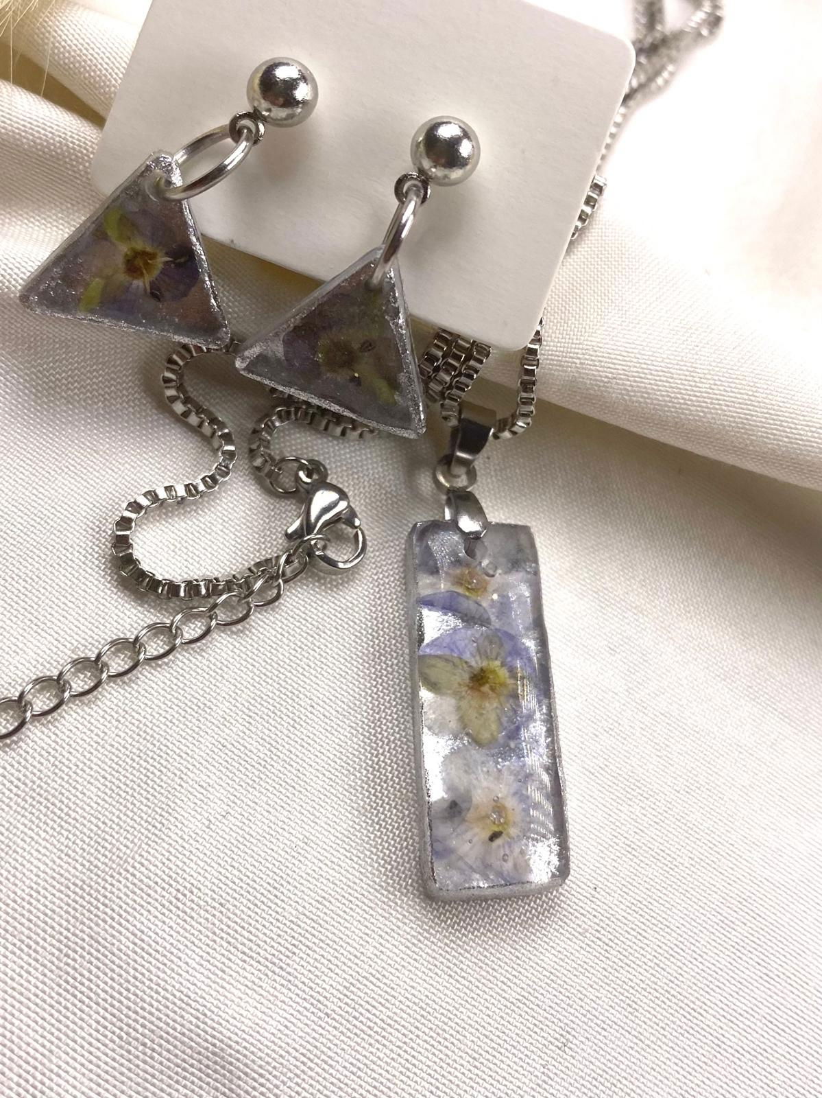 Descriere: lantisor patrat, argintiu, din otel inoxidabil, cu pandantiv dreptunghiular si cercelusi triunghiulari, din rasina decorata cu flori naturale de nu-ma-uita. Lungime cercei: 2 cm, greutate: 1,26 grame.