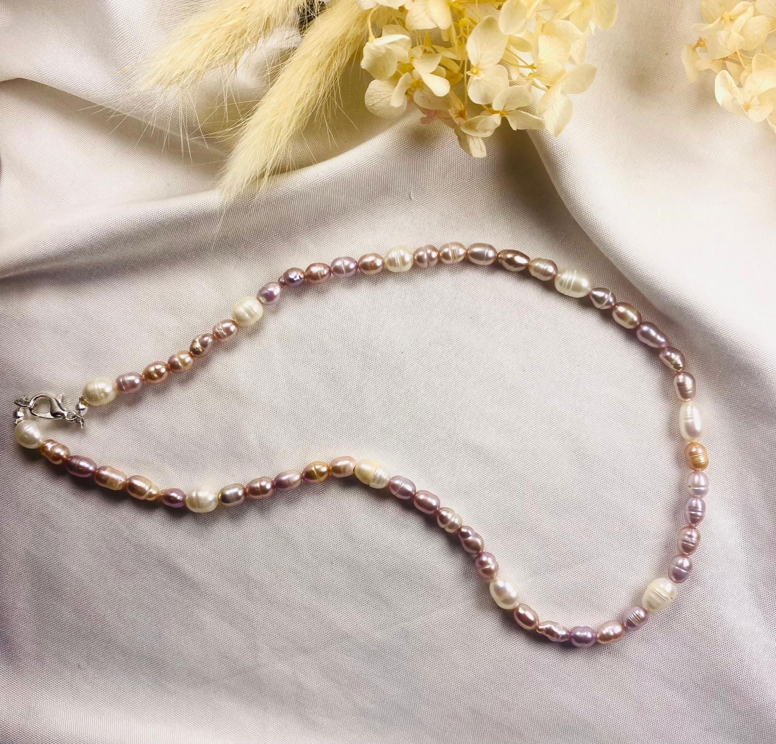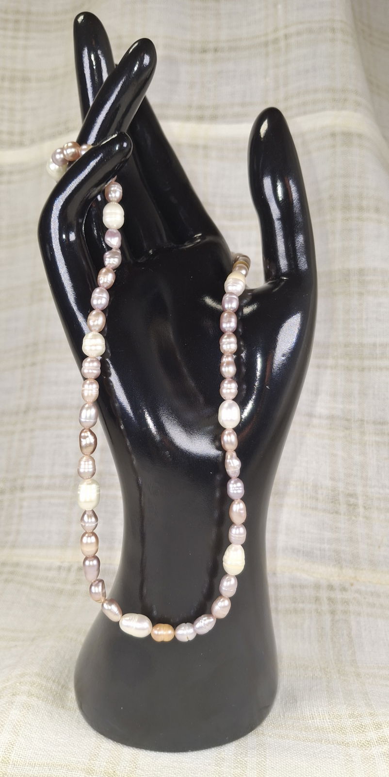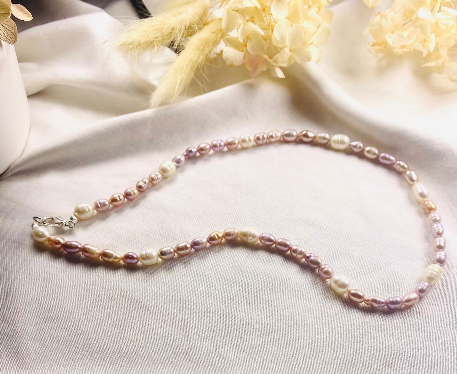 Descriere:Colier din perle de cultura mov si albe, pe baza elastica, cu accesorii argintii din otel inoxidabil.