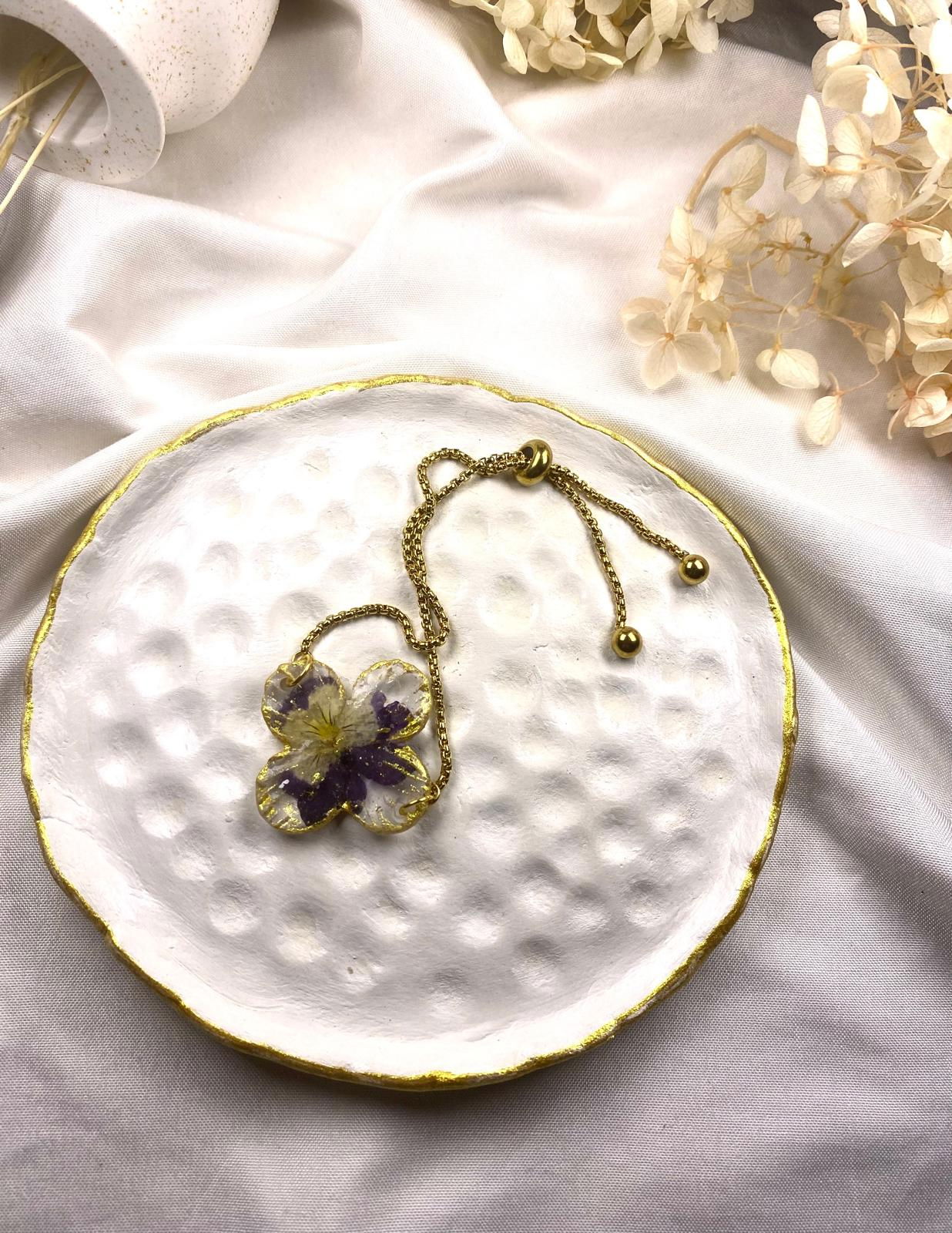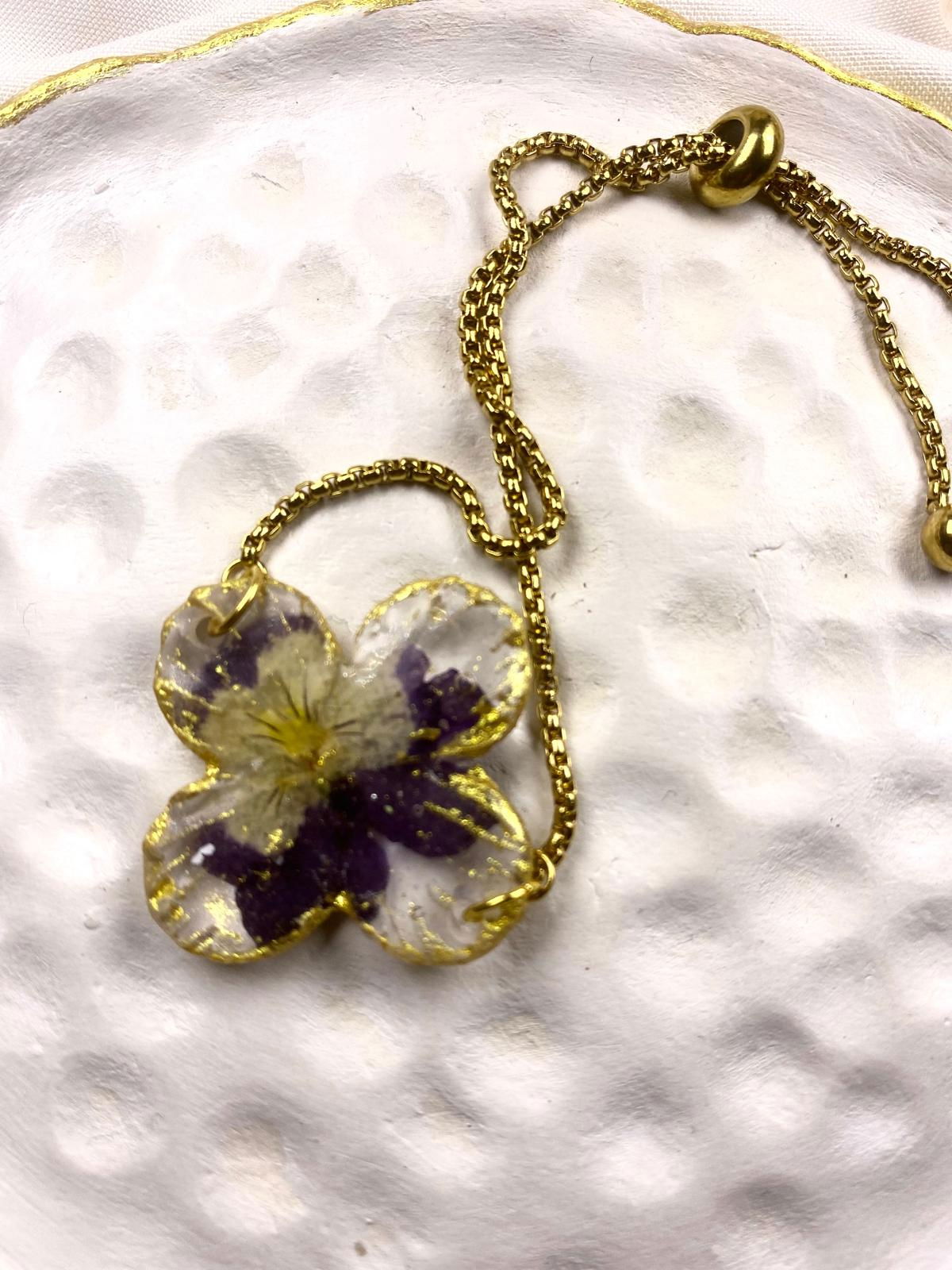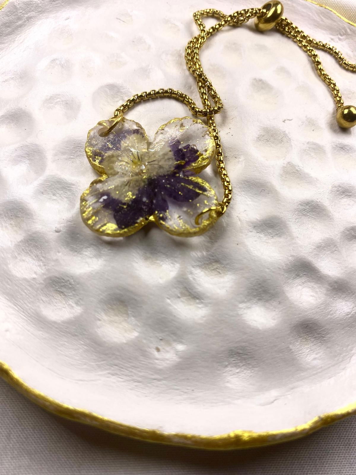 Bratara reglabila, aurie, decorata cu o panseluta montata in rasina.