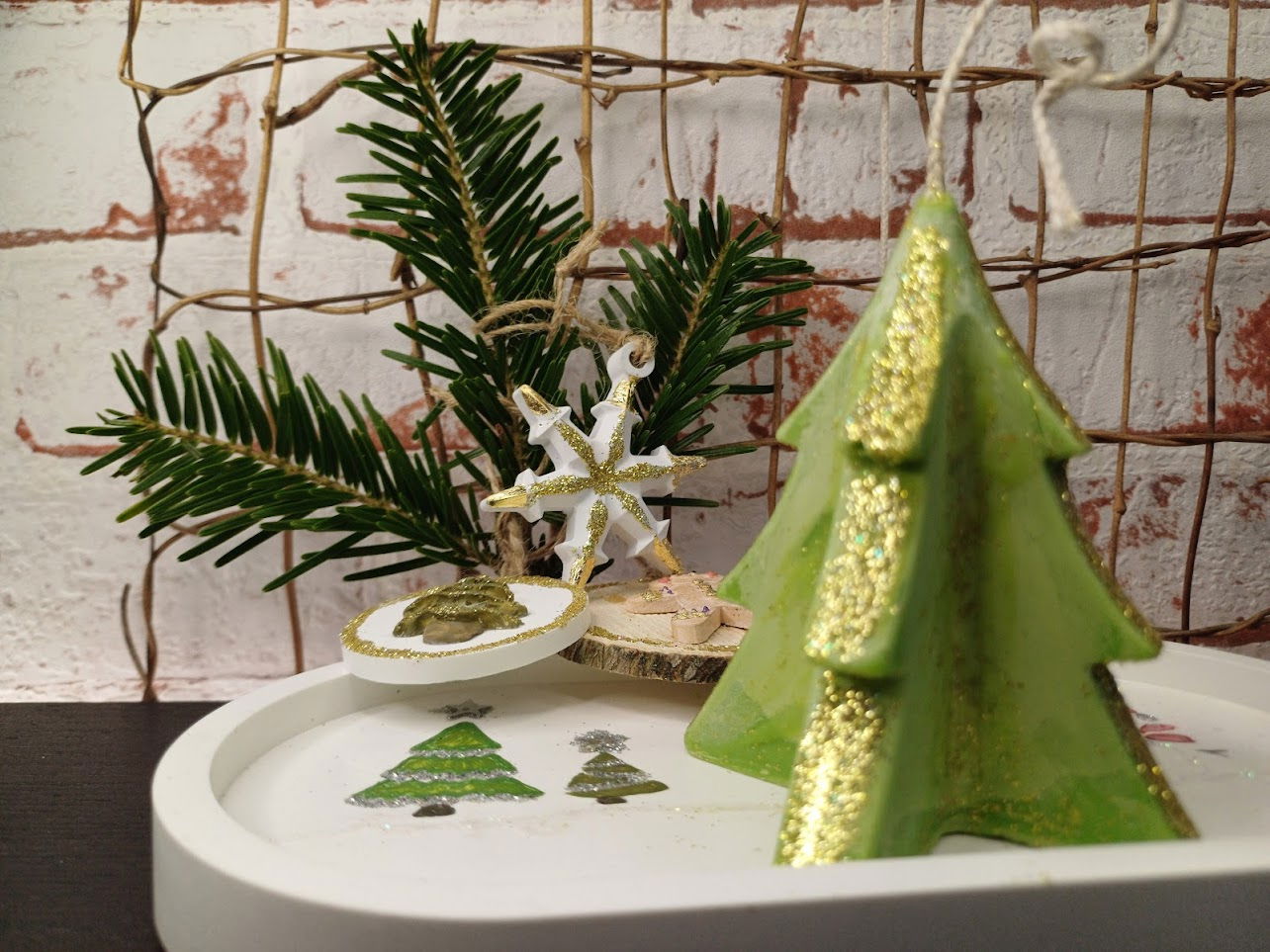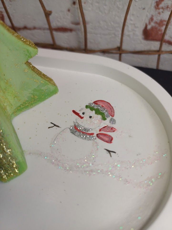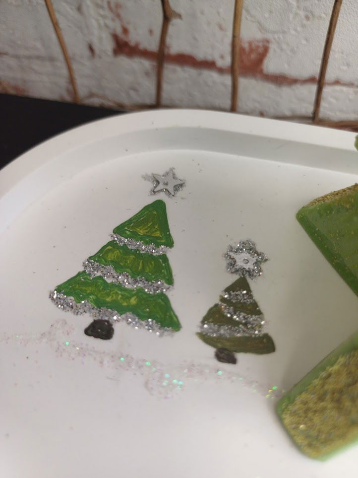 Set decorativ care îmbină farmecul natural cu artisticul, aducând o atmosfera festivă în fiecare colț al casei. Acest set se compune dintr-o lumanare din ceară de soia în forma de bradut și un suport din ceramica oval, pictat  manual cu un peisaj de iarna.