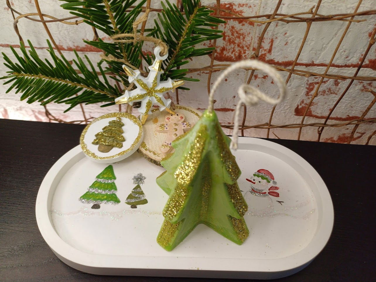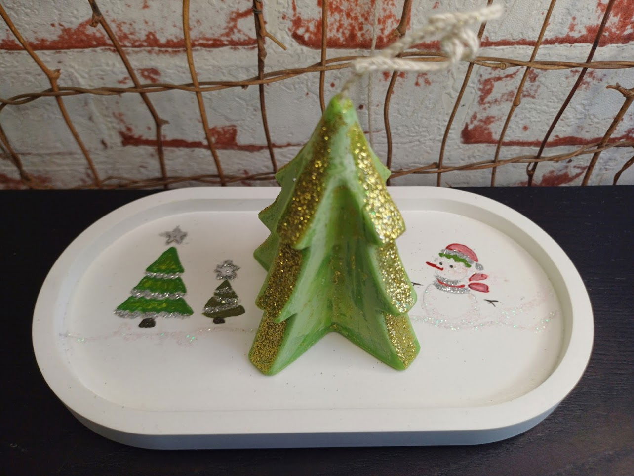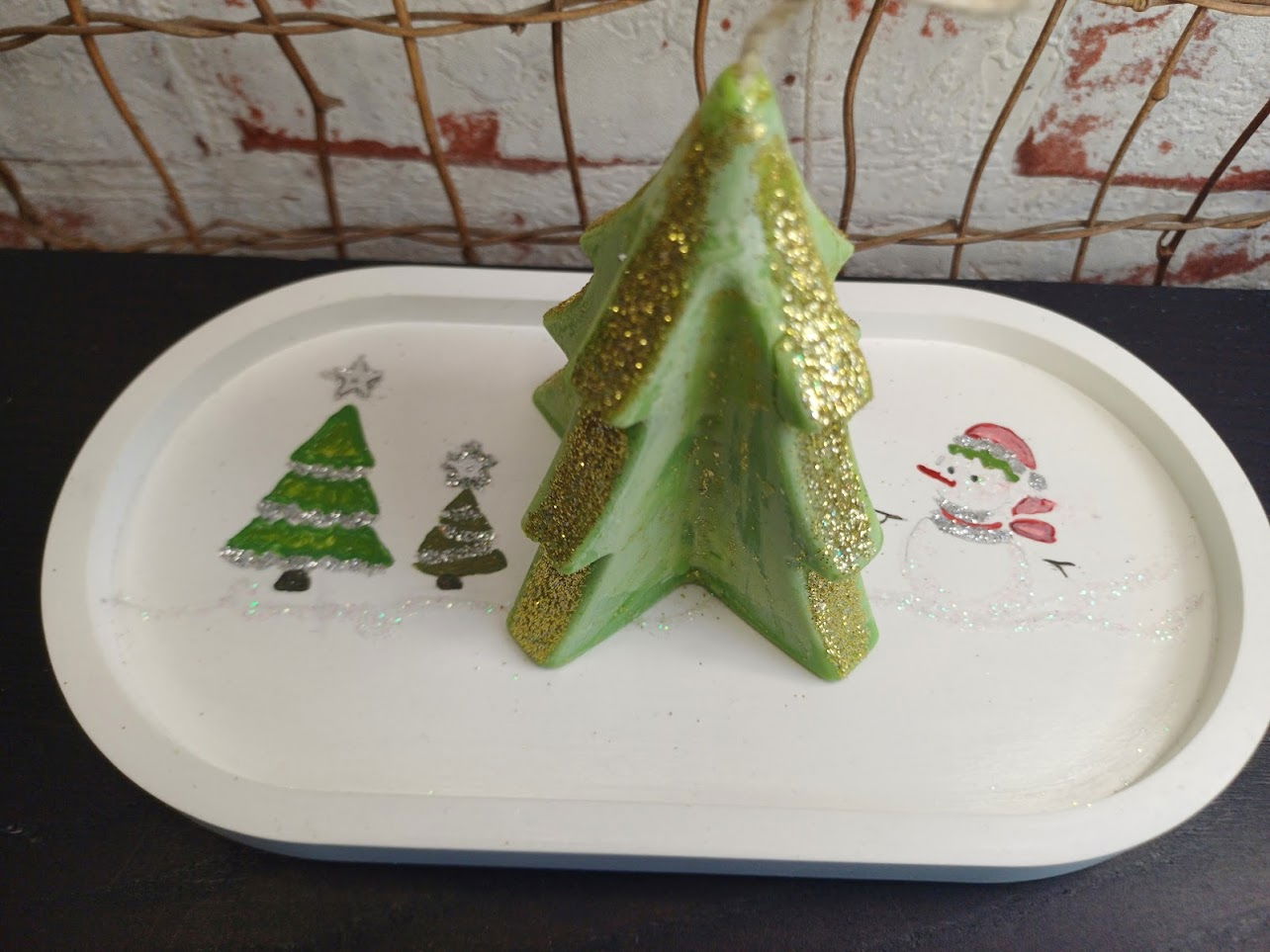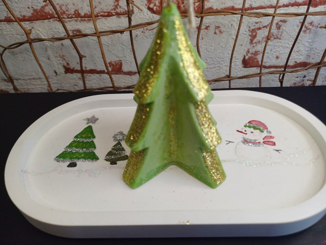 Set decorativ de Craciun: lumanare bradut plus suport oval pictat manual