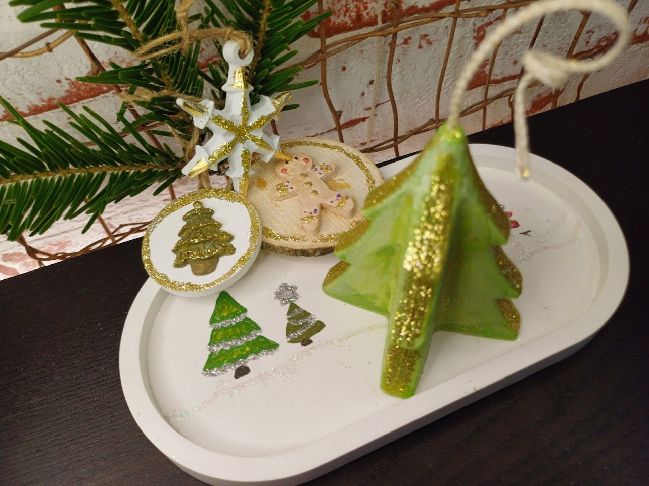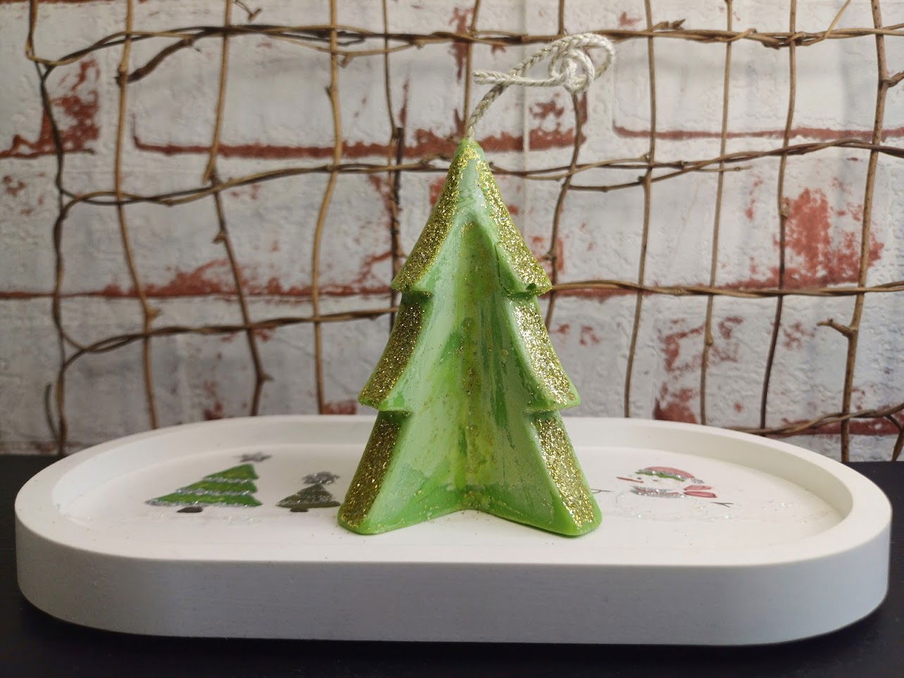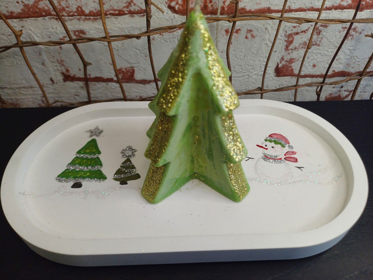 Set decorativ de Craciun: lumanare bradut plus suport oval pictat manual