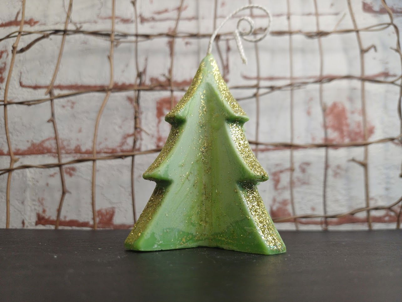 Lumanarea în forma de brad devine punctul focal al aranjamentului. Bradutul verde cu accente aurii sugerează spiritul tradițional al Crăciunului, transformându-se astfel într-o mică sculptură luminoasă ce aduce farmec în orice încăpere.