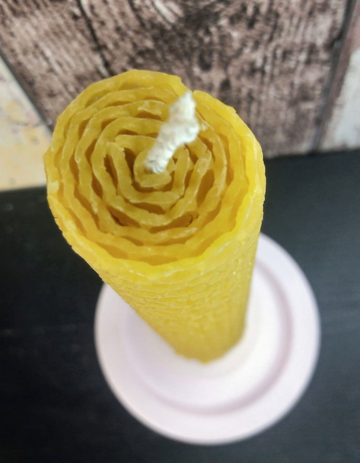 Lumanare decorativa din ceara naturala de albine cu suport rotund de ceramica.