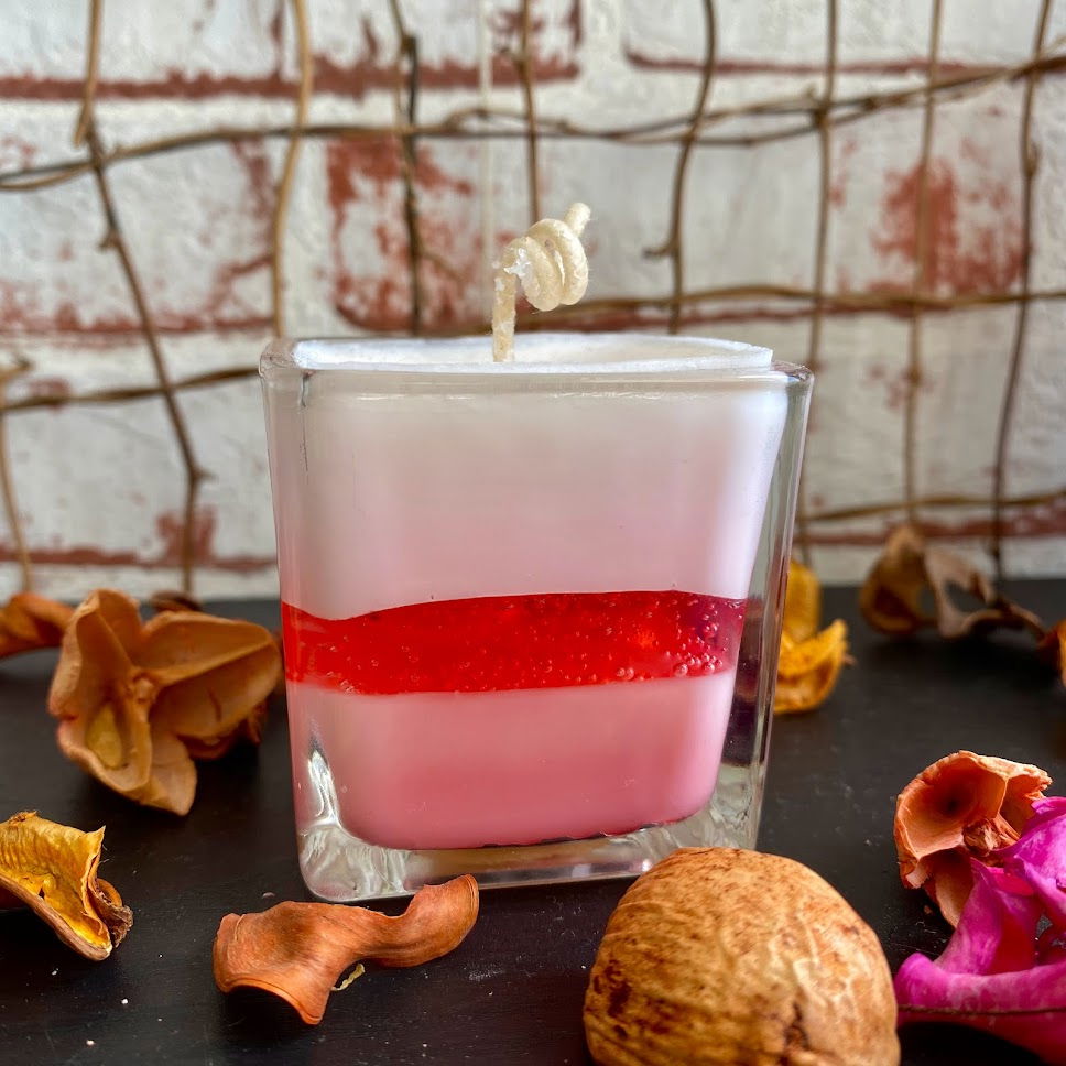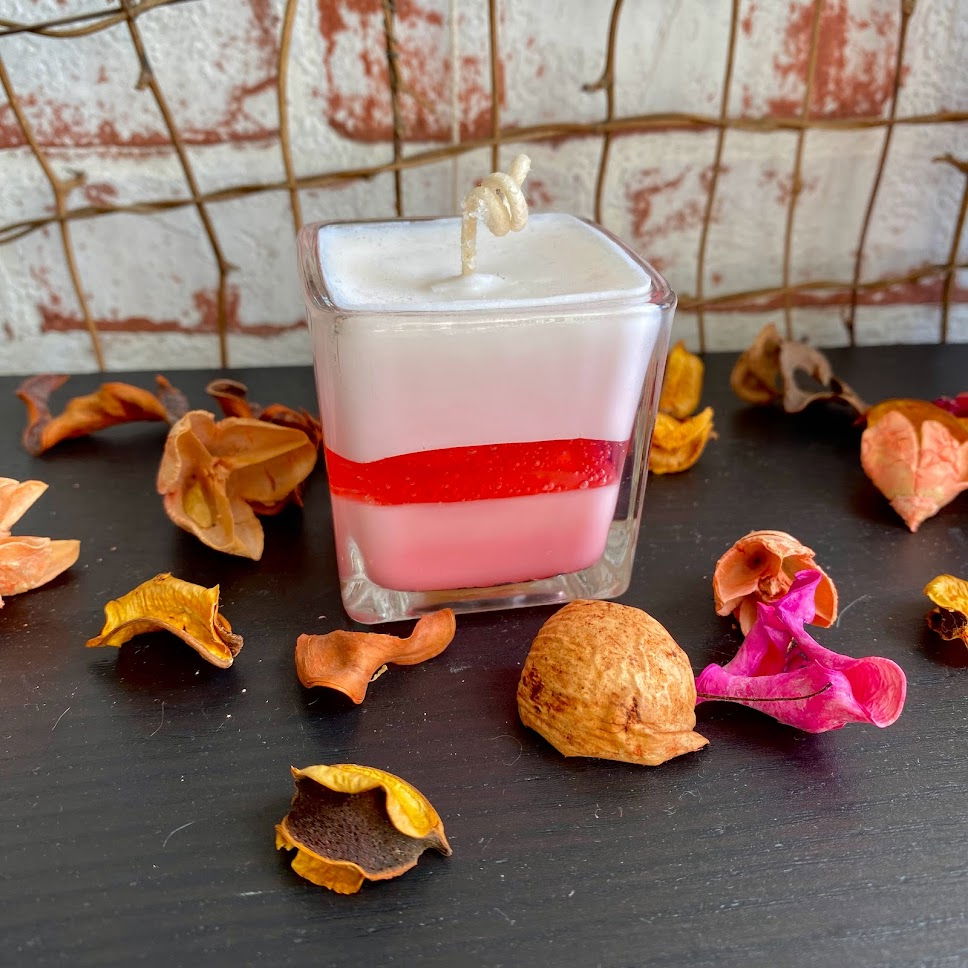 Lumanare parfumata trei culori in pahar de sticla patrat. Lumanare din ceara de soia 100% ecologica, non toxica.