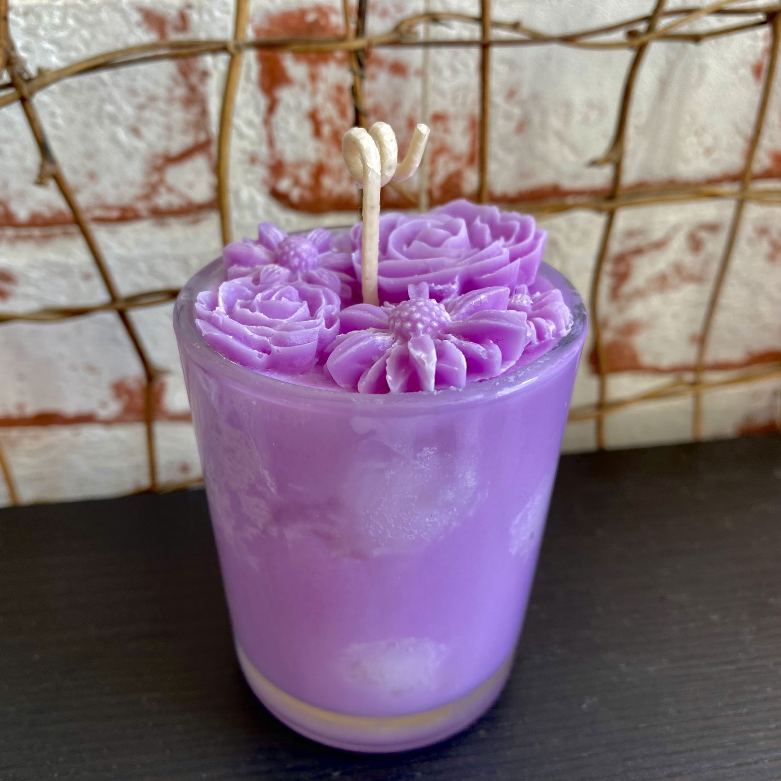 Lumanare parfumata " Buline si flori ", mov, in pahar de sticla mic. Lumanare din ceara de soia 100% ecologica, mov cu buline albe, decorata cu flori mici din ceara.