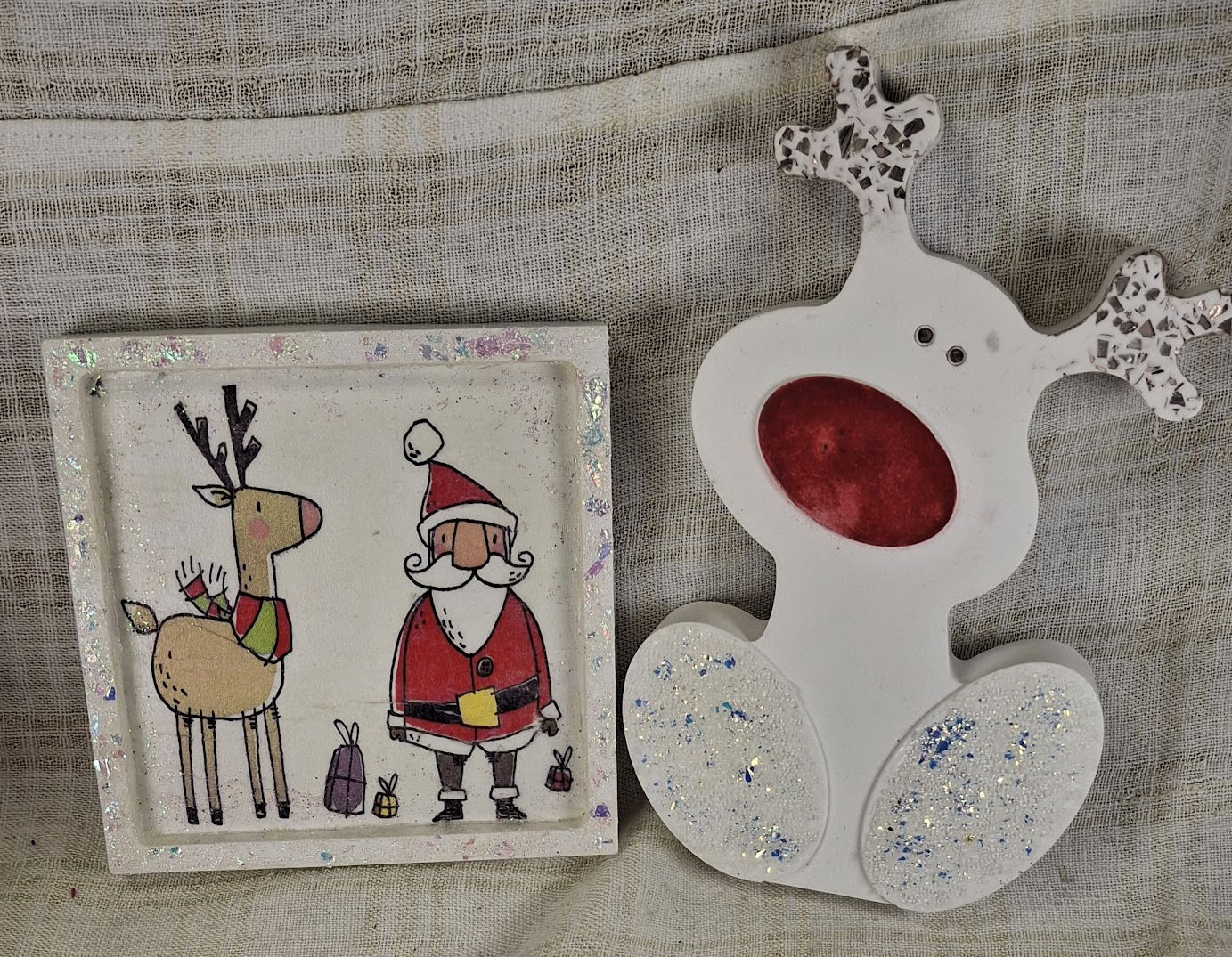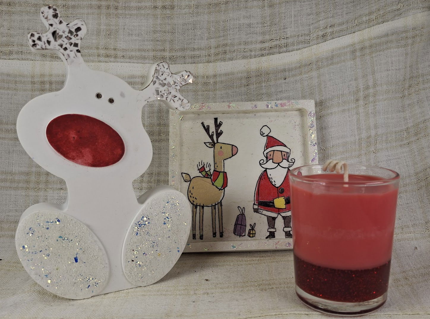 Set decorativ de Craciun - 'Rudolph & Santa' - lumanare plus suport din ceramica pictat manual
