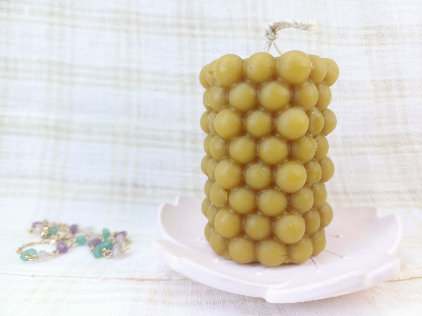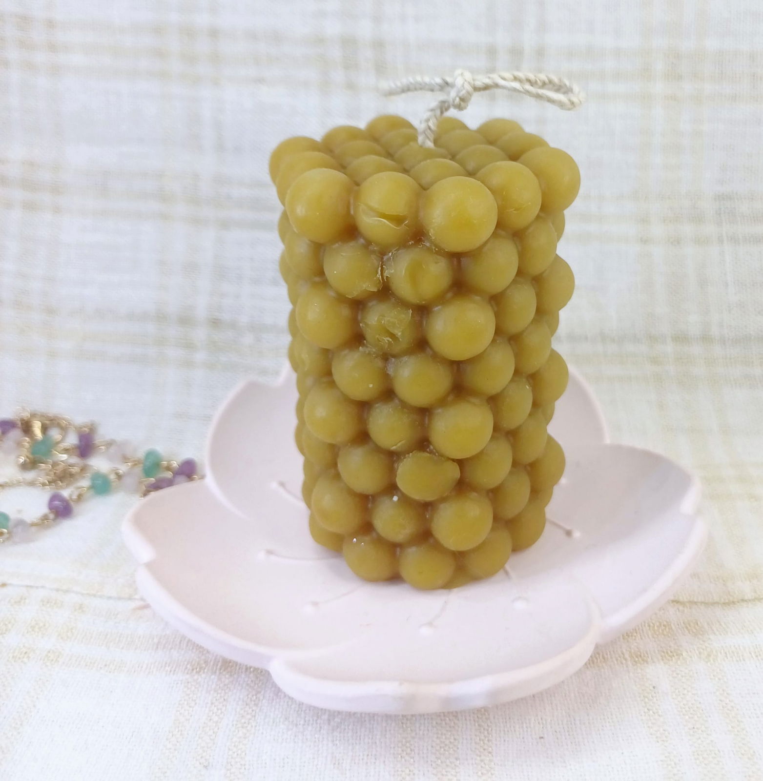 Lumanare decorativă cu adevărat specială, care emană o atmosferă caldă și fermecătoare. Cu forma sa cilindrică și bulele jucăușe, această lumanare din ceară de albine, aduce un farmec unic în spațiu. Alături de aceasta se află un suport în formă de floare, care adaugă o notă suplimentară de eleganță și naturalețe întregului ansamblu. Suportul, cu petale delicate și contururi fluide, este realizat astfel încât să susțină lumanarea într-un mod gratios și atrăgător. Acesasta farfuriuta completează perfect designul lumanării, creând un ansamblu armonios și plin de farmec.