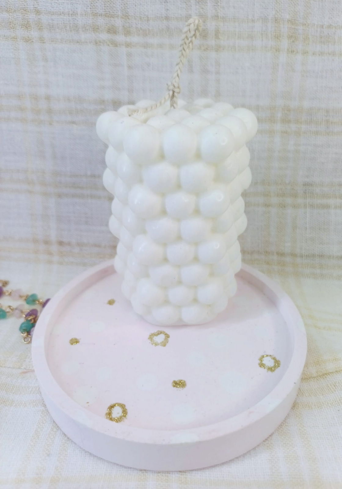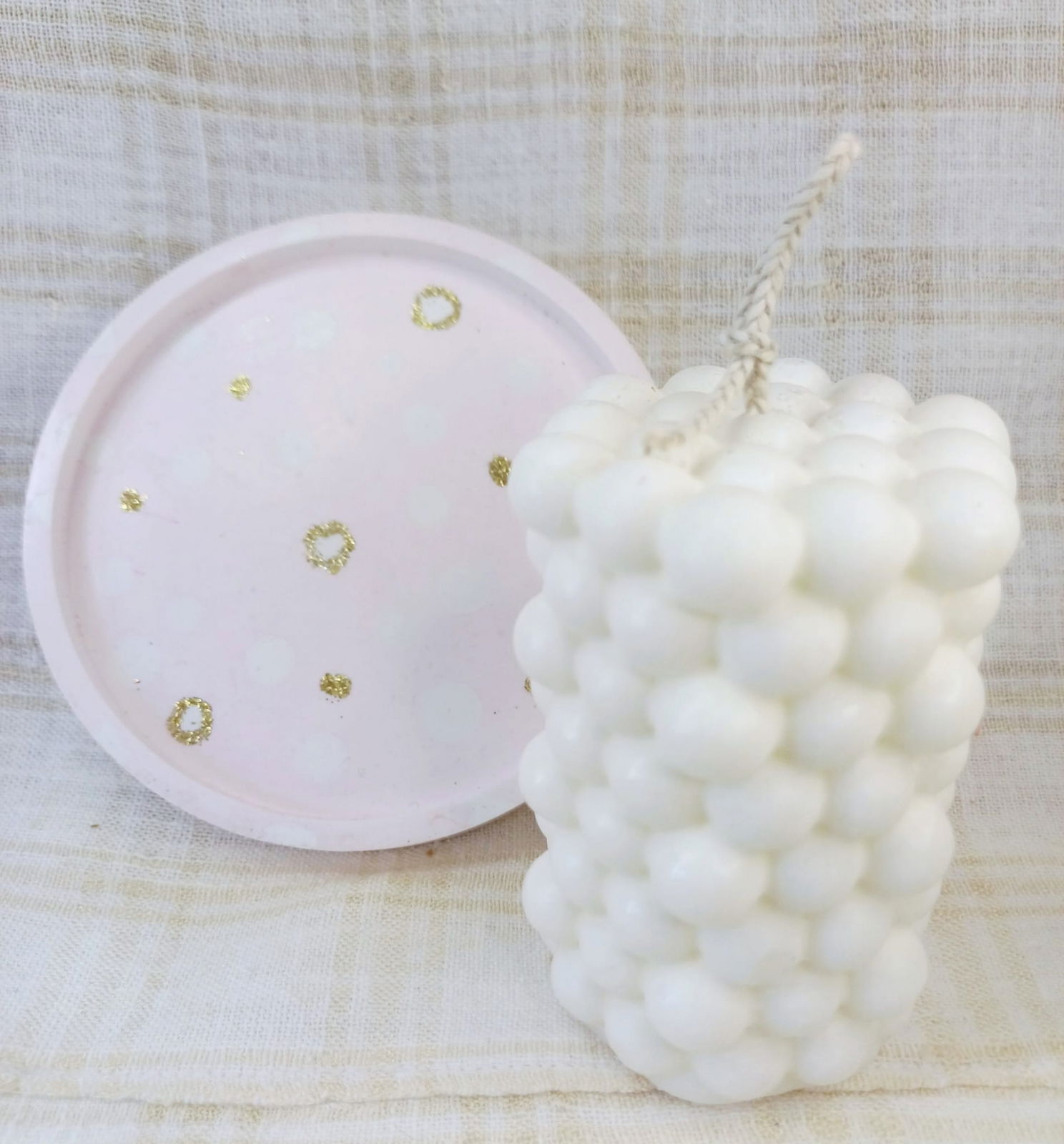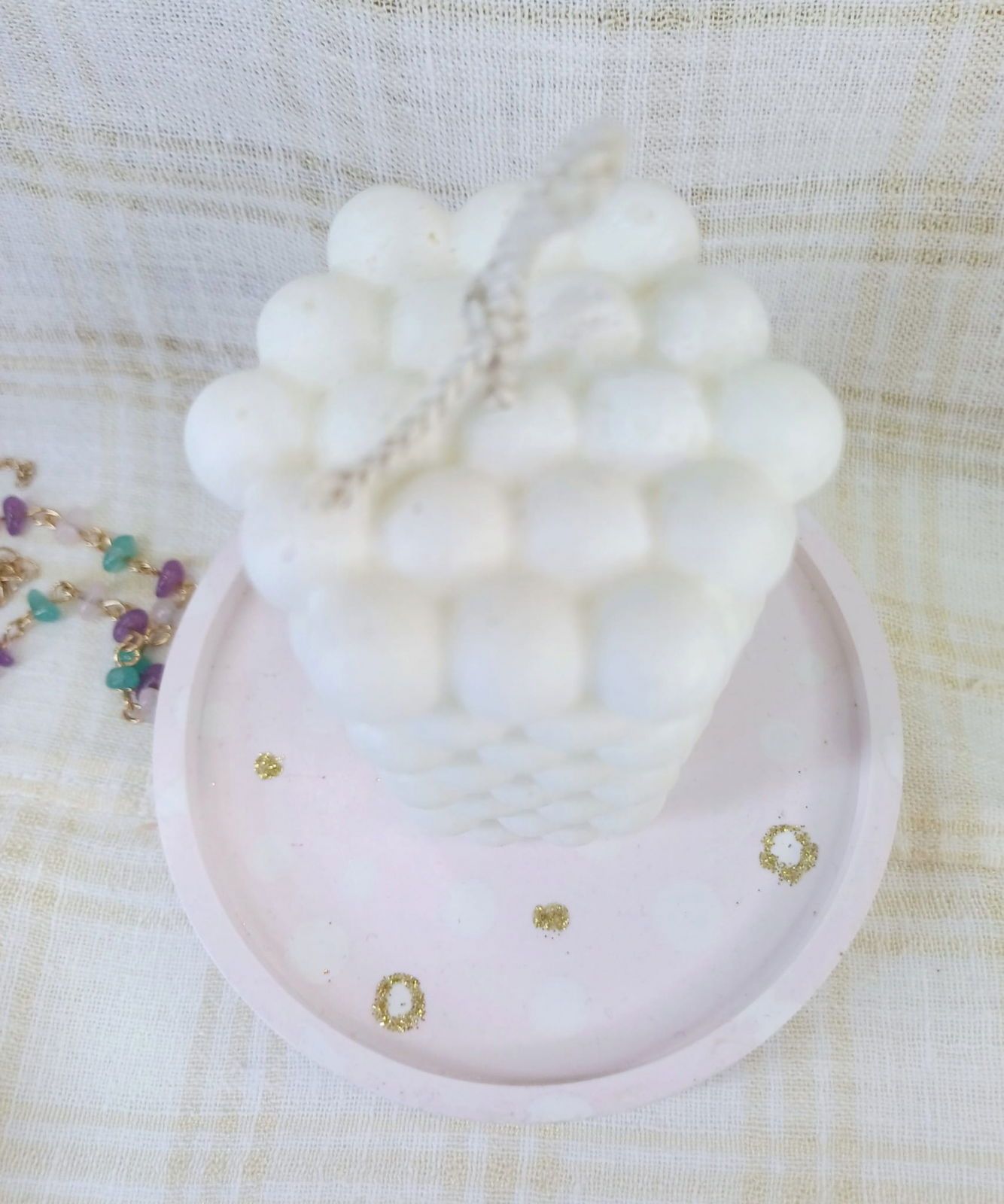 Lumanare parfumata "bubble" din ceara de soia ecologica + farfurie ceramica handmade roz pal cu bulinute aurii. O lumânare decorativă ca aceasta poate adăuga un element de delicatețe și rafinament în orice încăpere. Aroma sa este astfel aleasa incat sa completeze subtil atmosfera. Ea poate fi plasată în diverse spații, de la dormitor la living sau chiar pe o masă festivă contribuind la crearea unei atmosfere placute prin nota de caldura si romantism pe care o aduce.