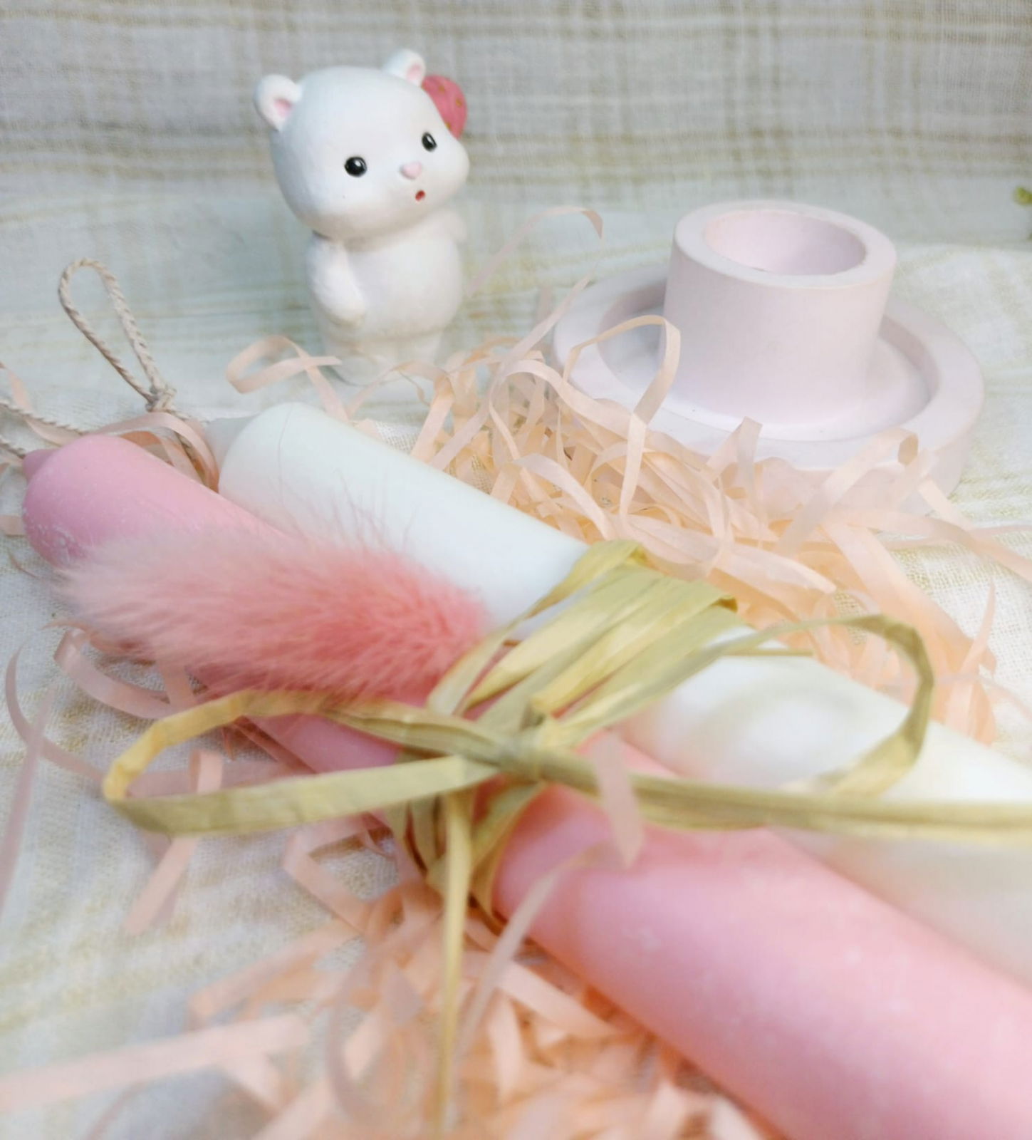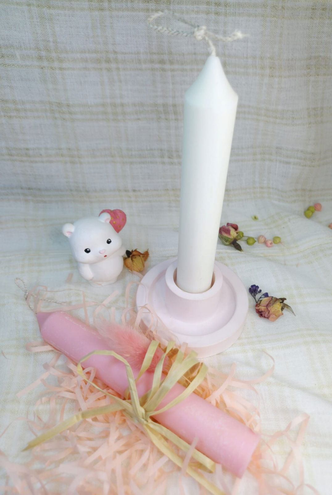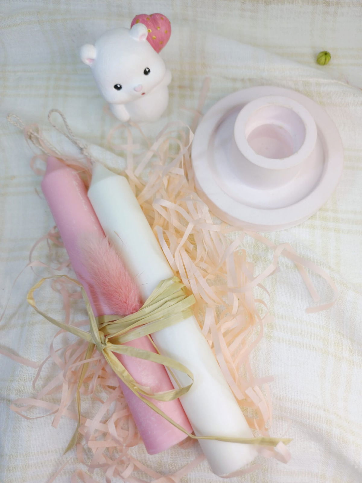 Acest set aduce cu el o atmosferă de delicatețe și rafinament, îmbinând culoile feminine cu liniile subțiri și elegante ale lumanarilor. Sfesnicul aduce, prin culoarea sa ce completeaza culoarea lumanarilor, armonie si coeziune estetica intregii compozitii,