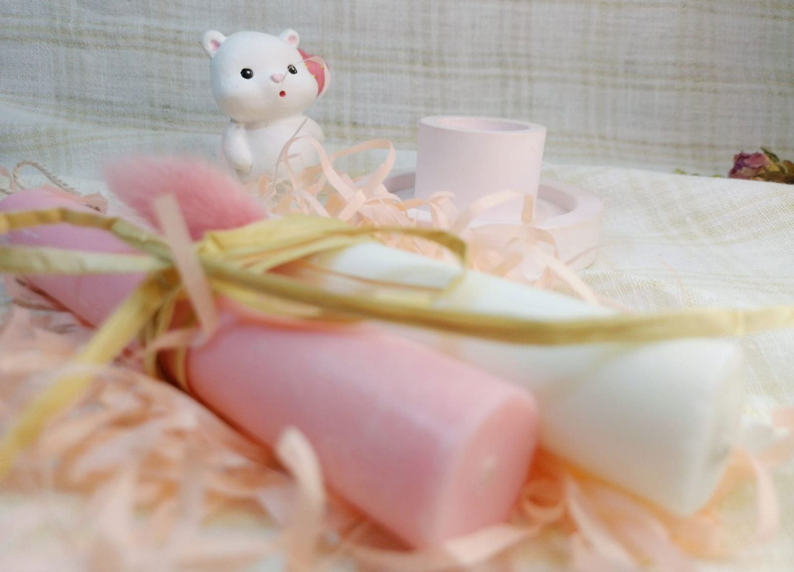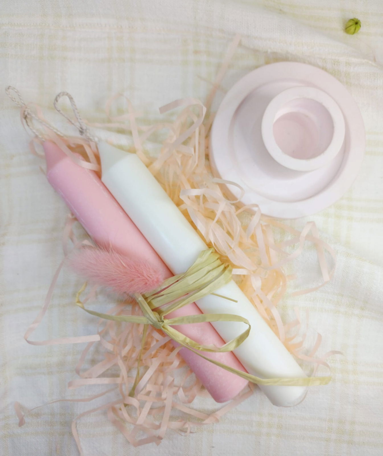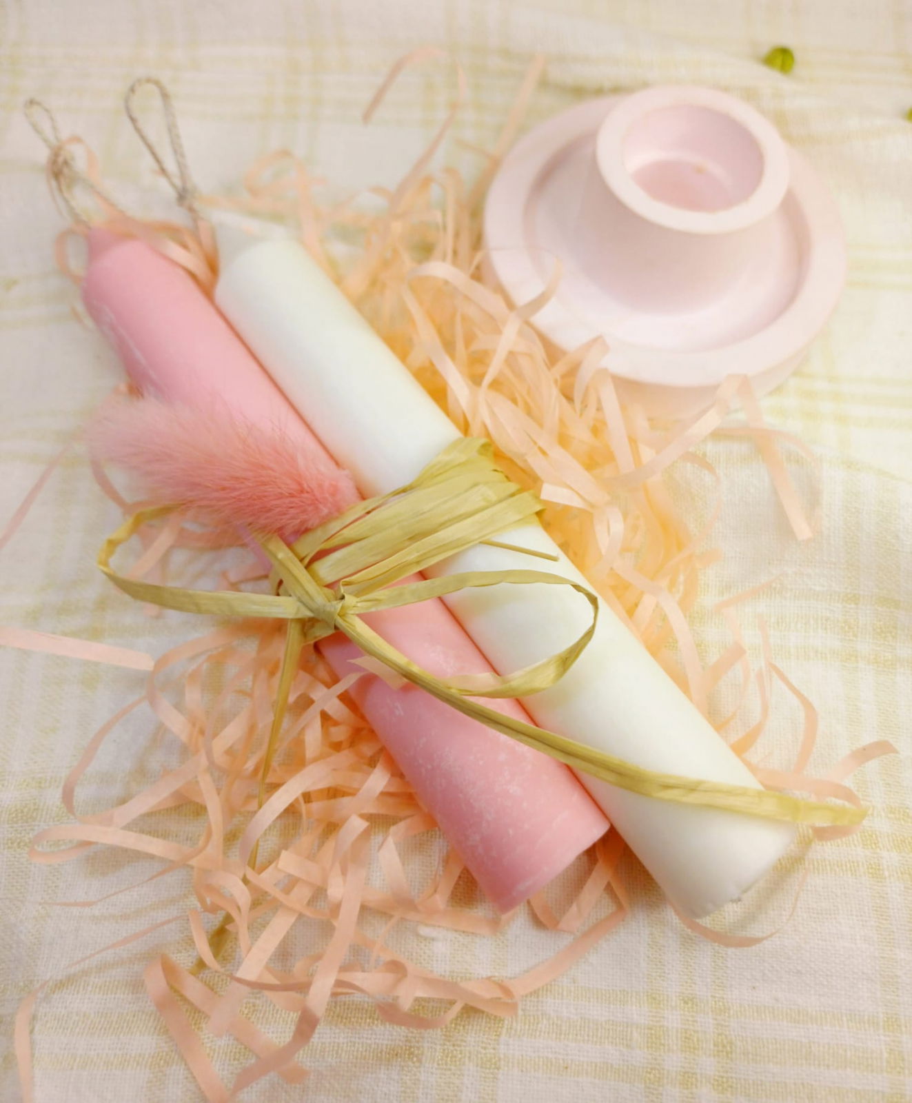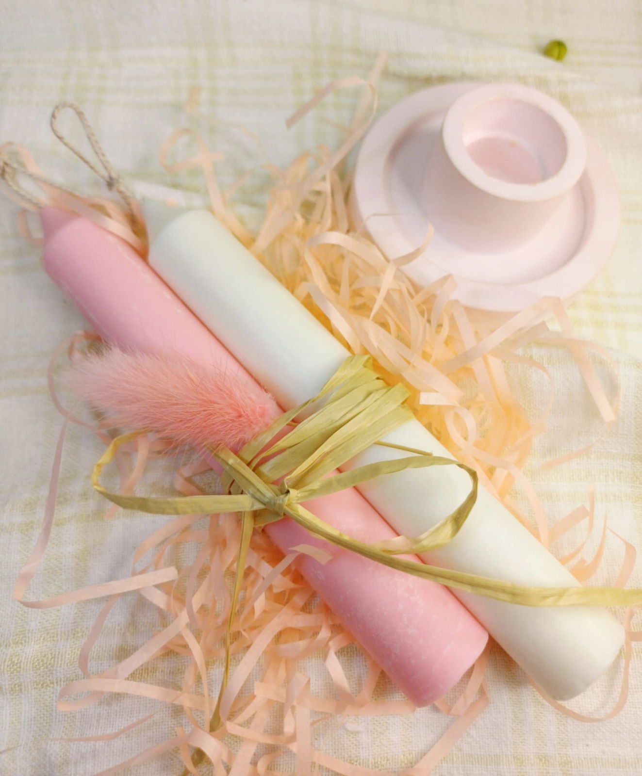 Acest set aduce cu el o atmosferă de delicatețe și rafinament, îmbinând culoile feminine cu liniile subțiri și elegante ale lumanarilor. Sfesnicul aduce, prin culoarea sa ce completeaza culoarea lumanarilor, armonie si coeziune estetica intregii compozitii,