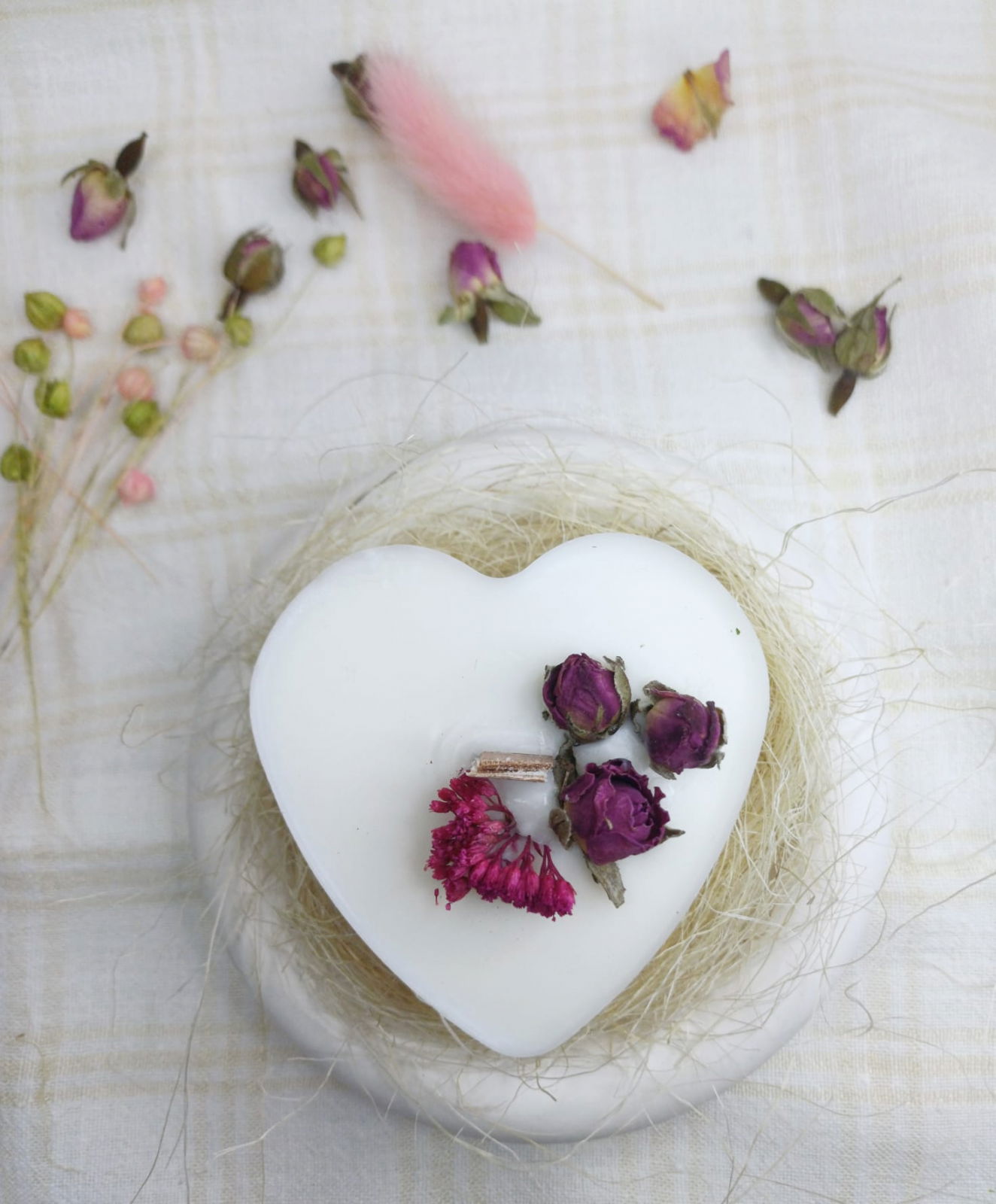 Set decorativ creat pentru a încânta privirile și a adăuga o notă romantică și de eleganță spațiului. Ansamblul este compus dintr-o lumanare din ceară de soia în forma unei inimi albe, decorată cu bobocei de trandafir uscați și o farfurie din ceramica albă, cu o margine groasă, deosebit de fermecătoare.