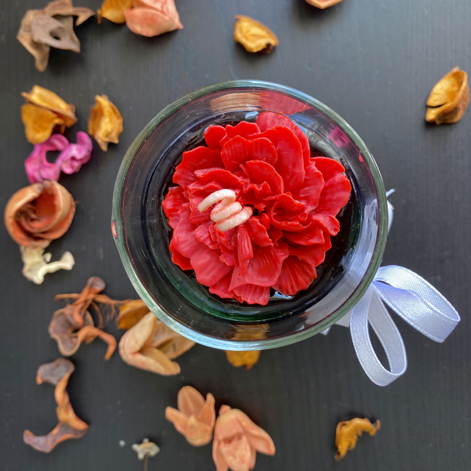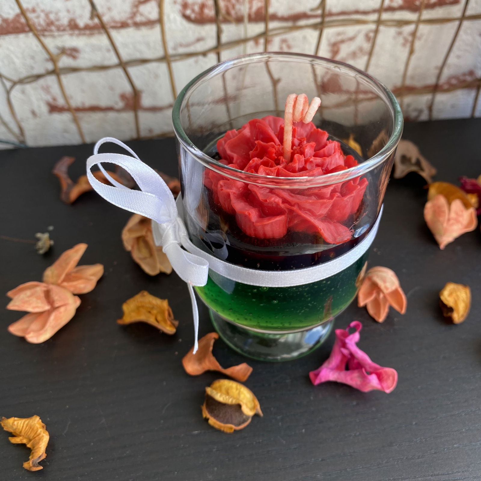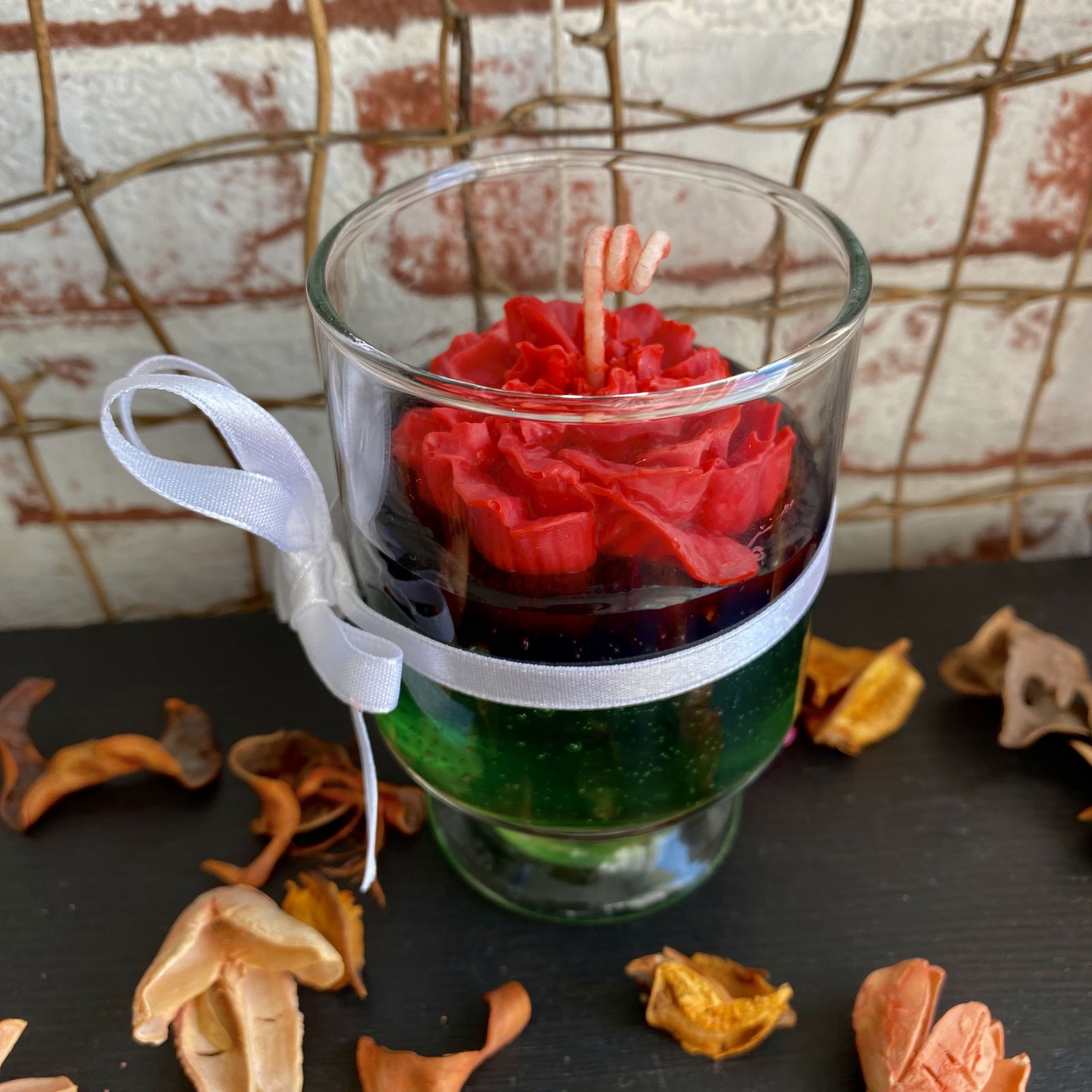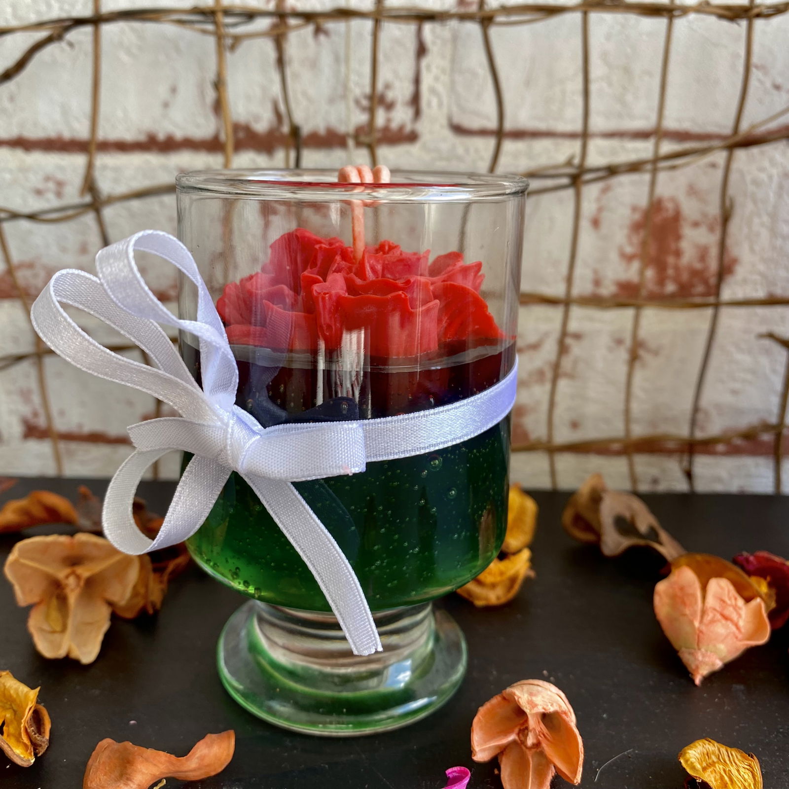 Lumanare parfumata din ceara-gel verde inchis, decorata cu o floare mare, rosie de trandafir. Realizata manual din ceara de soia 100% bio, vegana, non-toxica si ceara gel.