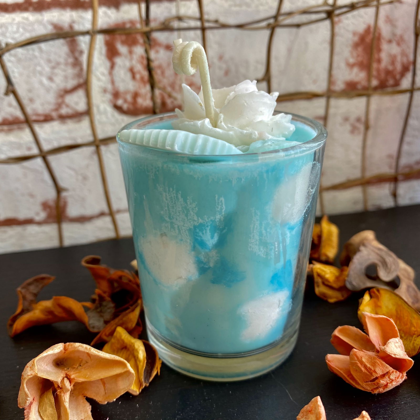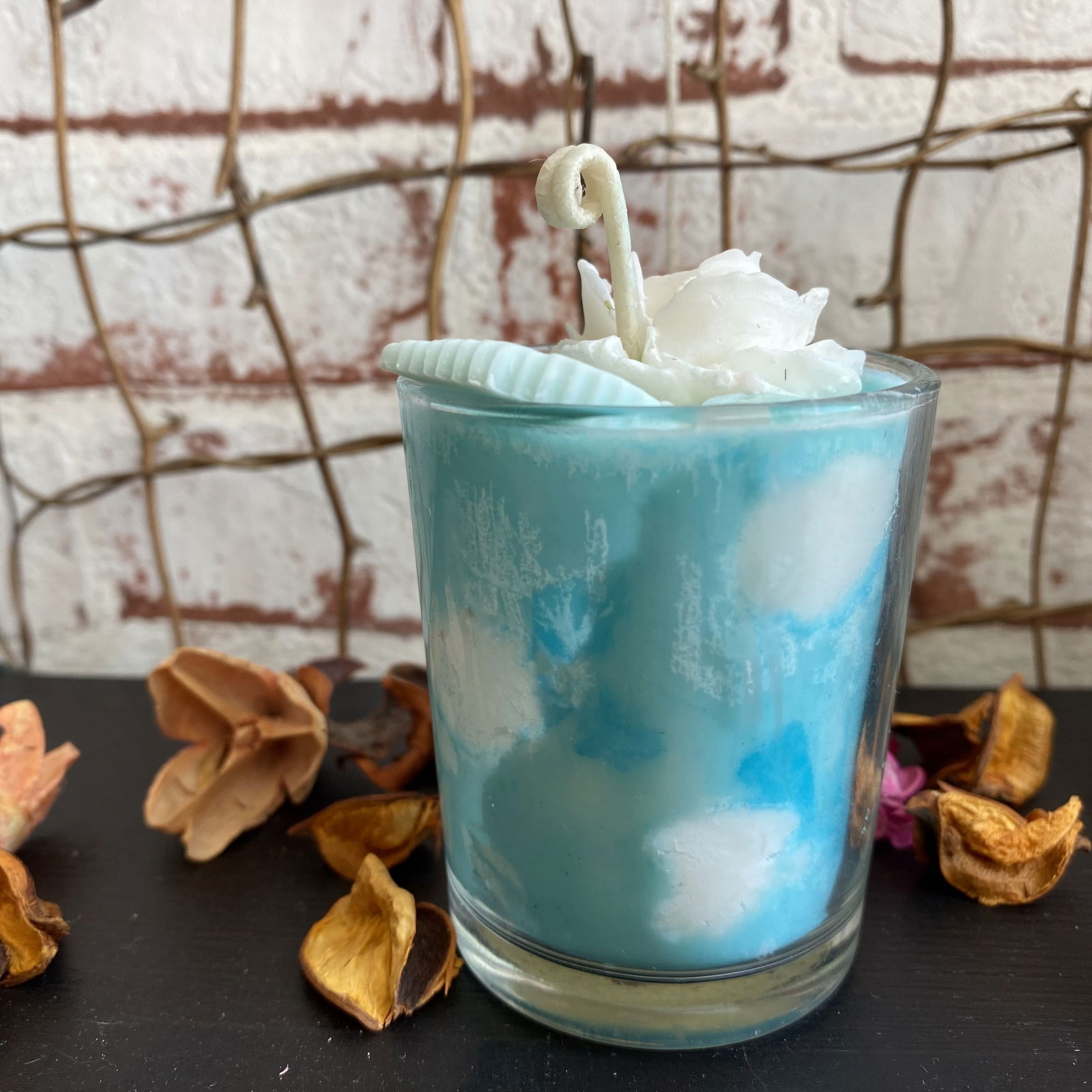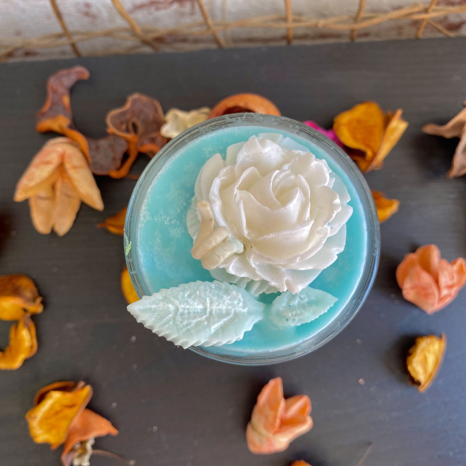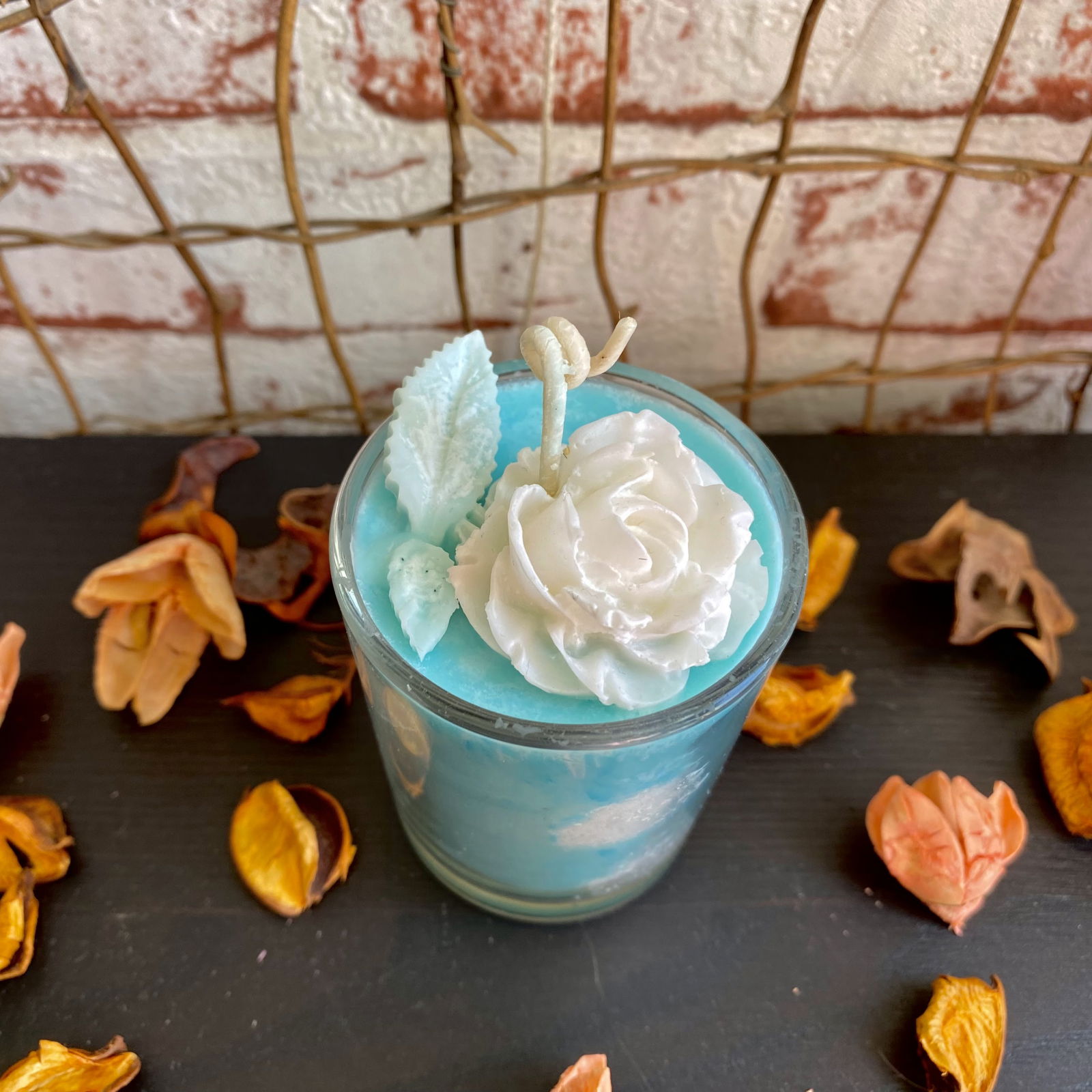 Lumanare parfumata " Buline si flori ", turcoaz, in pahar de sticla mic.