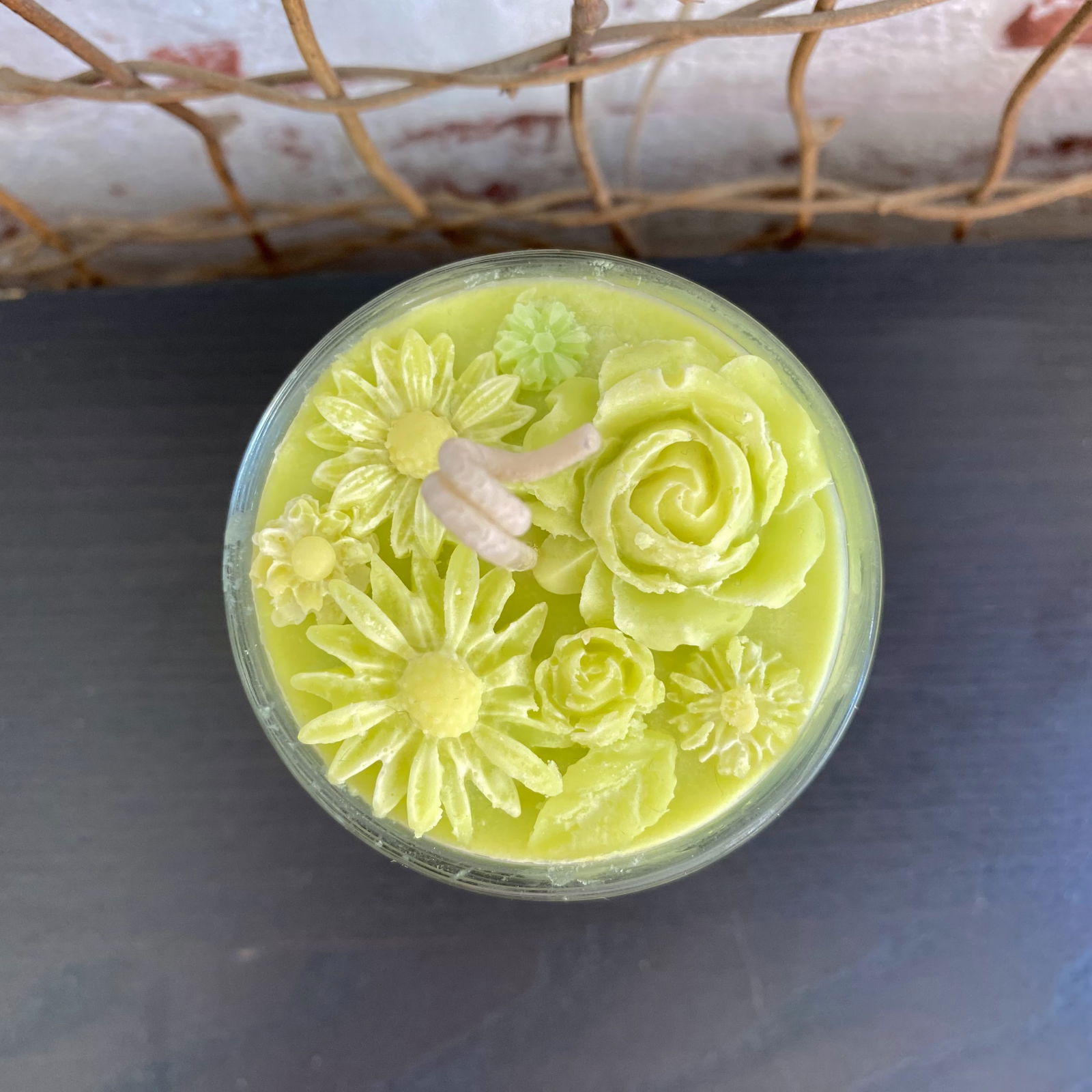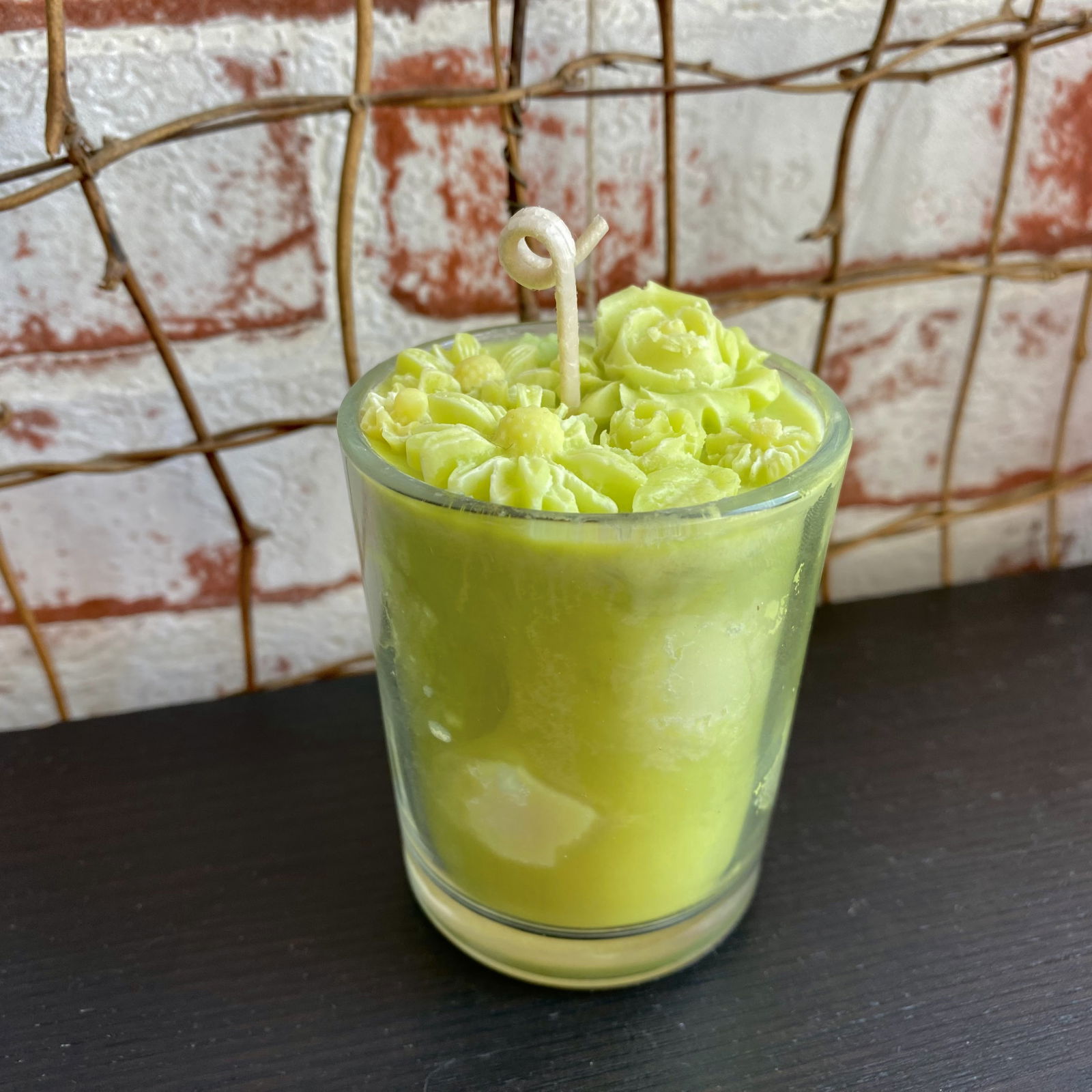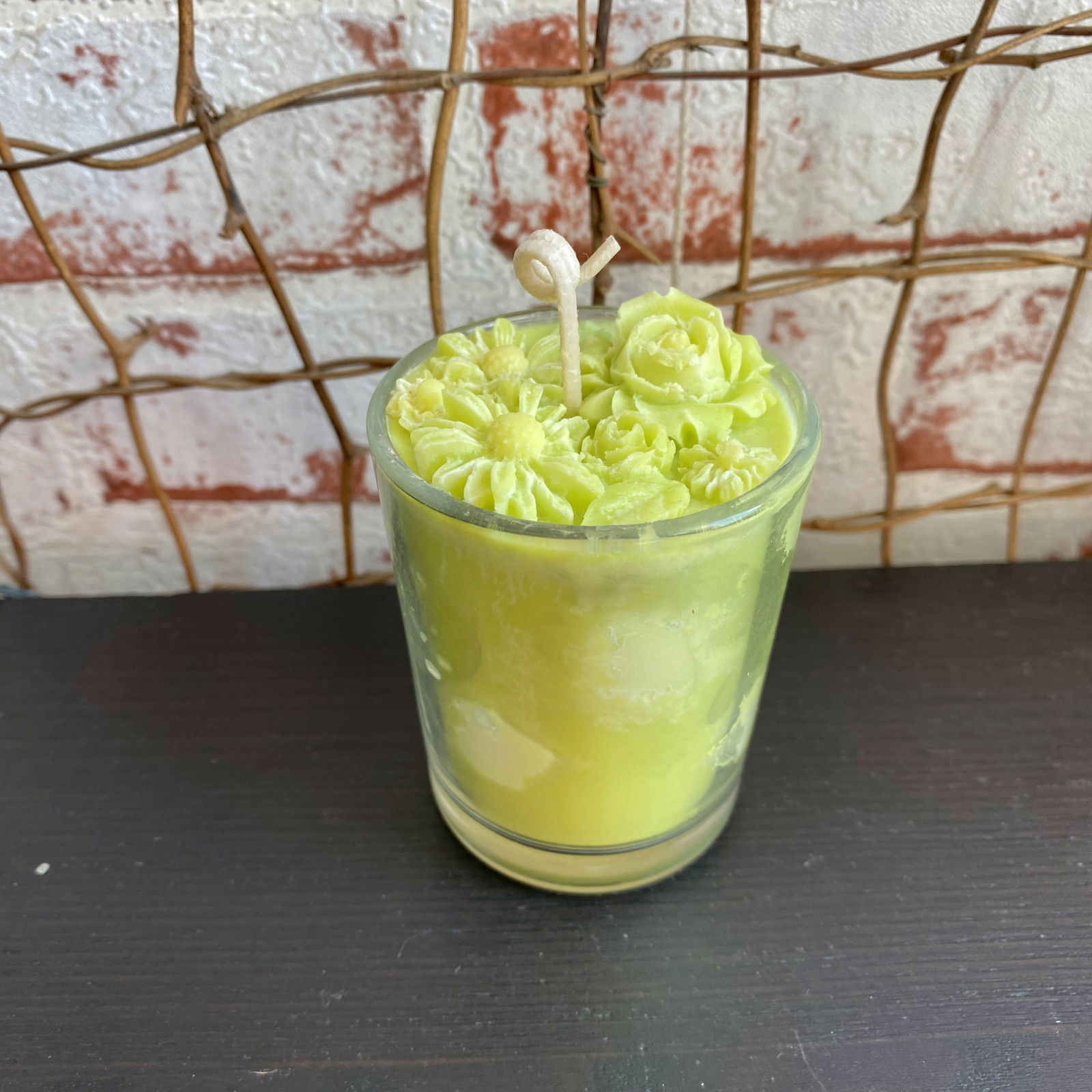 Lumanare parfumata " Buline si flori ", verde deschis, in pahar de sticla mic. Lumanare din ceara de soia 100% ecologica, verde deschis cu buline albe, decorata cu flori mici din ceara.