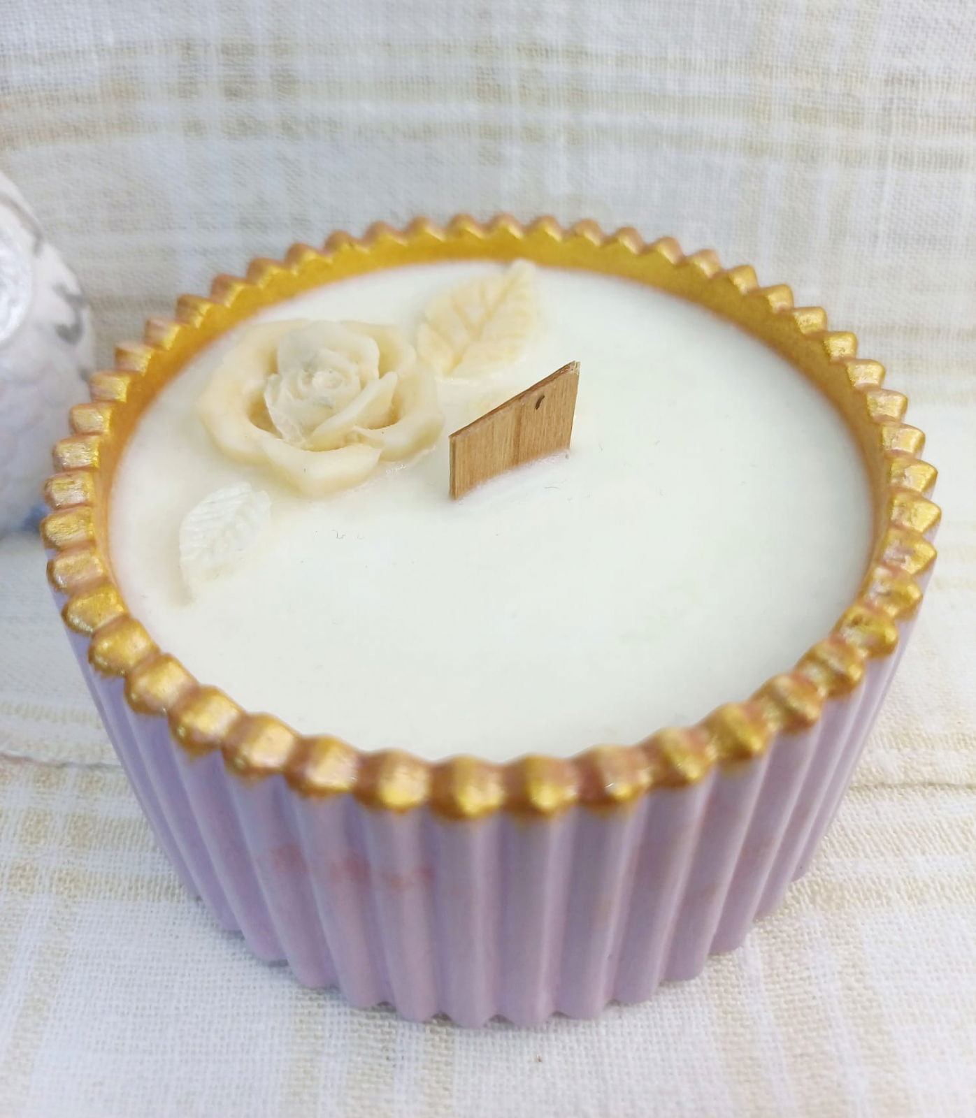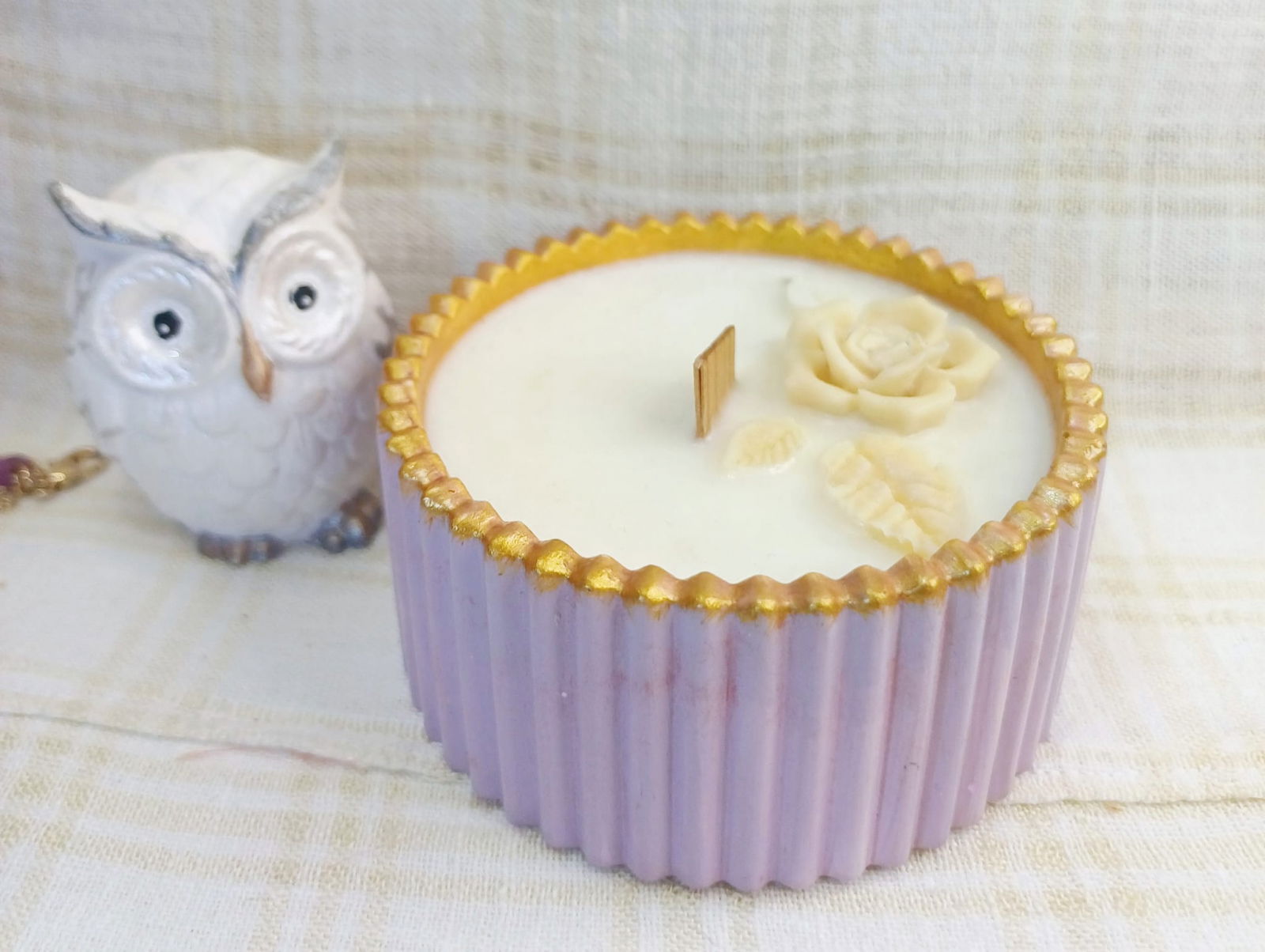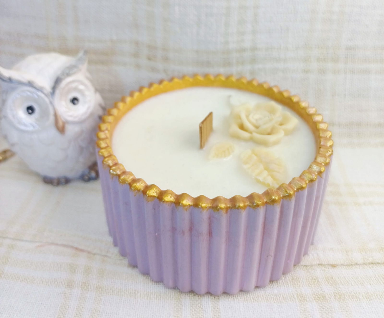 Bolul are o formă rotundă, oferind un aspect clasic și echilibrat. Realizat din ceramica, are o textură fină, cu striatii care adaugă un detaliu de eleganță. Exteriorul bolului este într-o culoare delicata de mov-lila, o nuanta care emana o eleganta discreta. Interiorul este finisat în auriu, adăugând un strop de lux și strălucire. Combinarea acestor culori creează o estetică sofisticată și atrăgătoare. Aceasta lumanare adauga o nota de eleganta spatiului in care este amplasata.