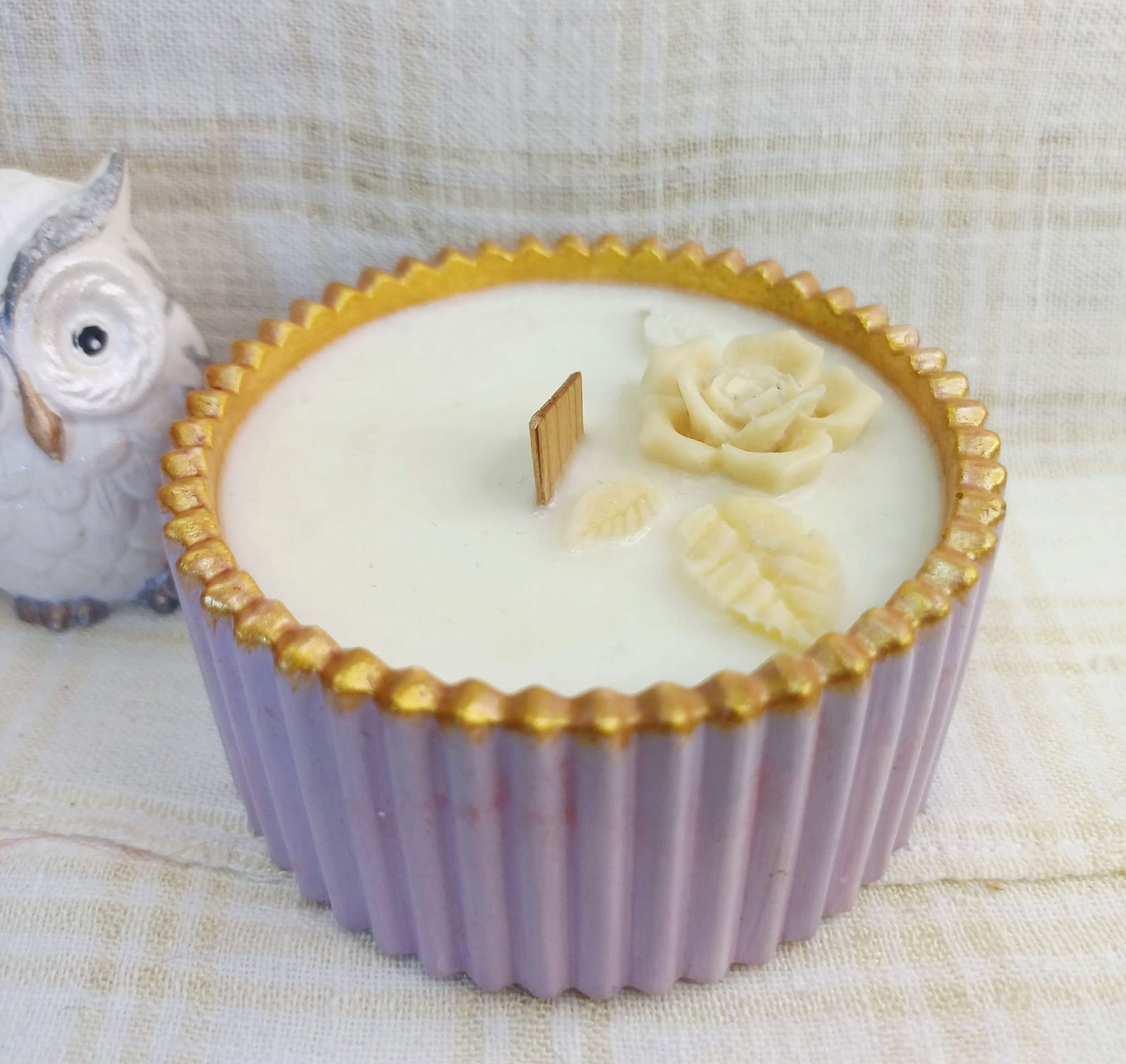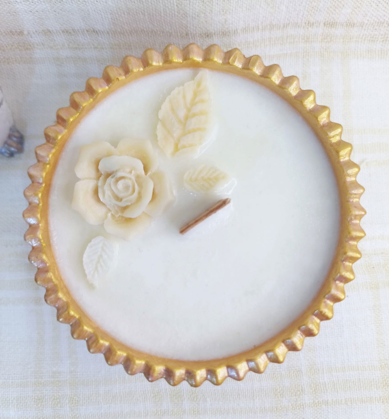 Lumanare din ceara de soia turnata in recipient /bol rotund din ceramica si decorata cu flori si frunze aurii si albe.