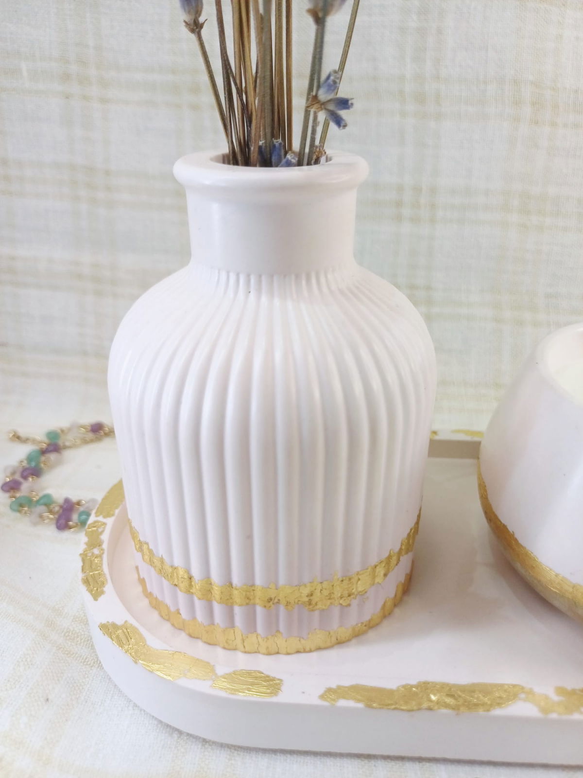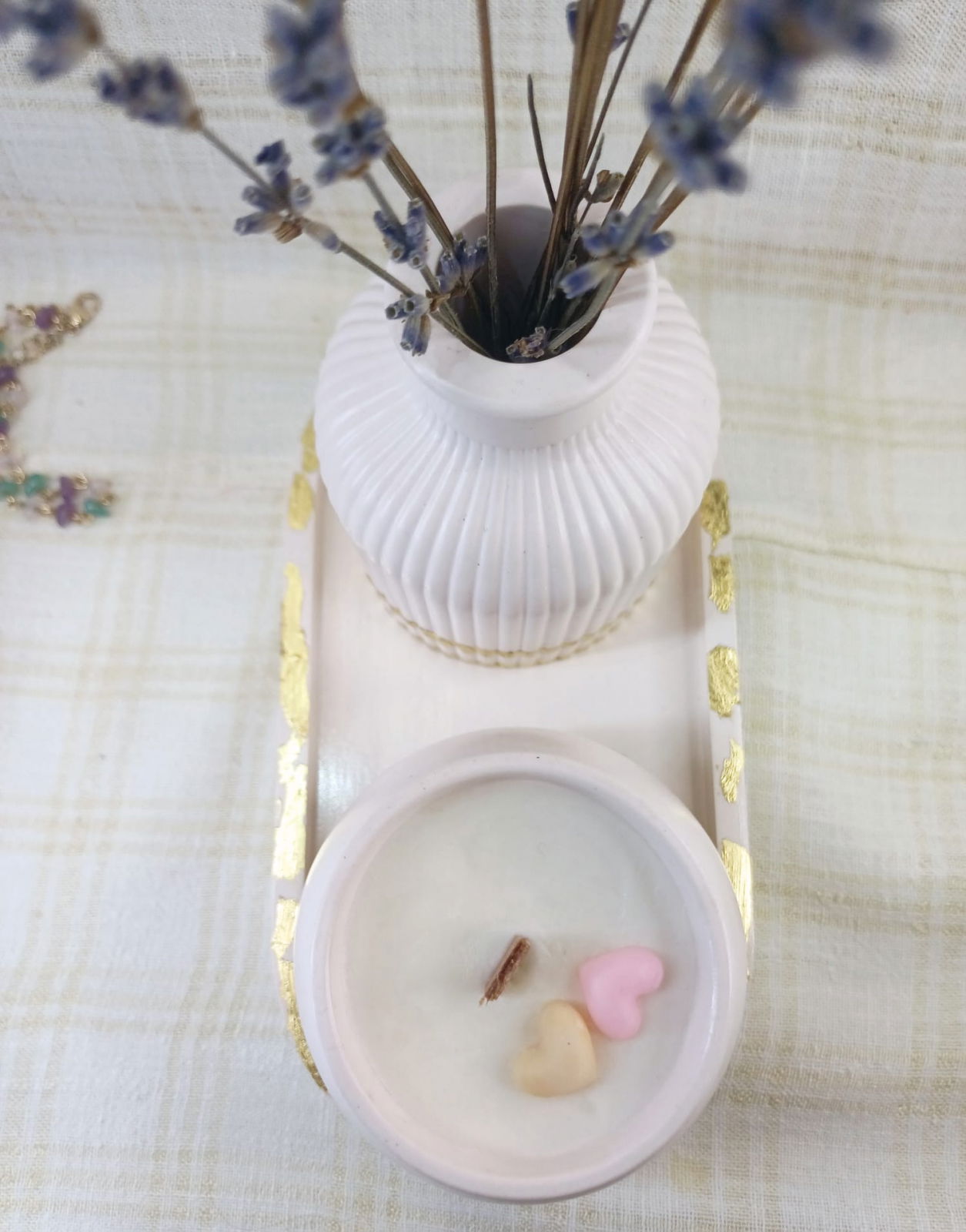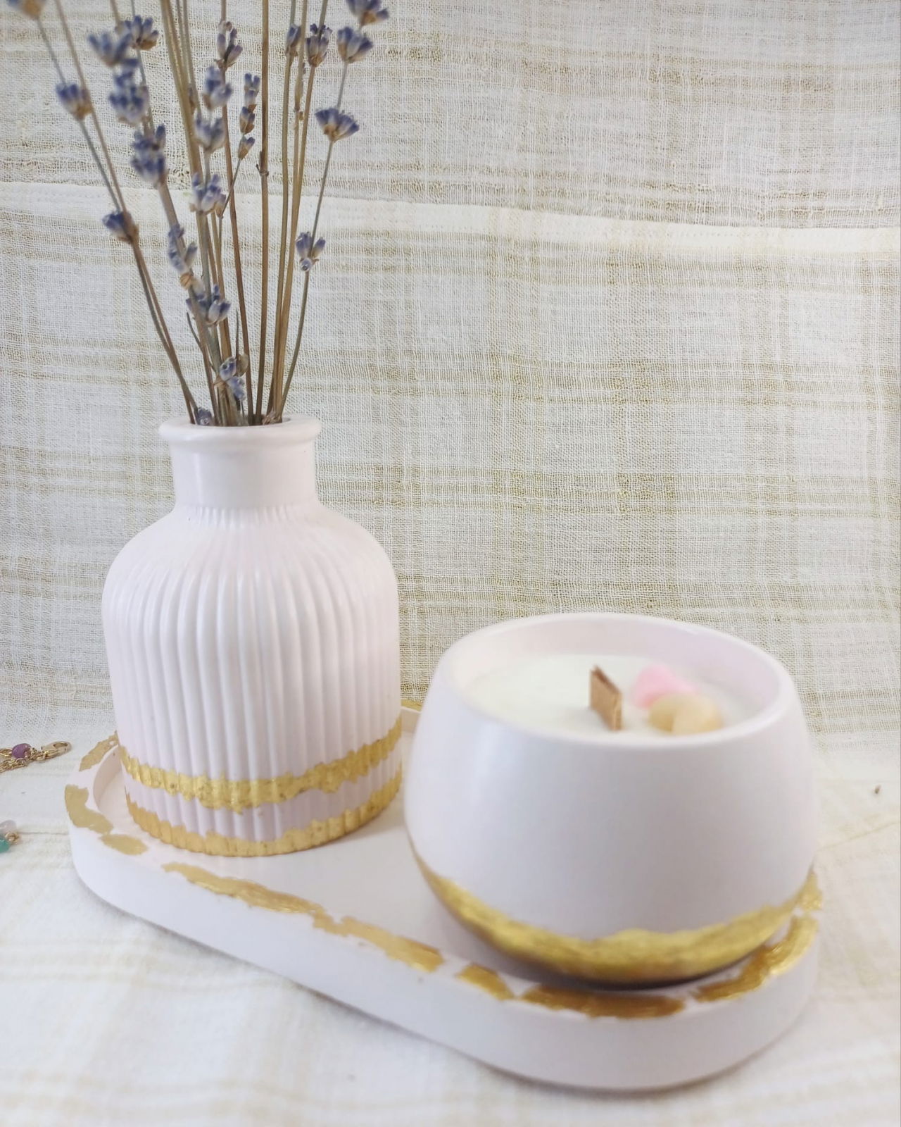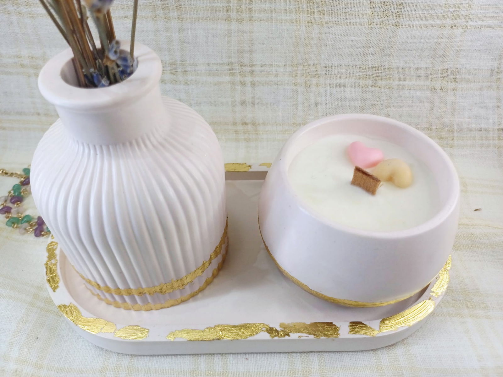 Set format din vaza de flori, suport oval si o lumanare din ceara de soia turnata in recipient /bol rotund din ceramica. Atât lumânarea, cât și vaza si farfuria ovala sunt intr-o nuanta roz deschis cu accente aurii, detalii care adaugă o notă de eleganță contribuind la aspectul decorativ al setului.