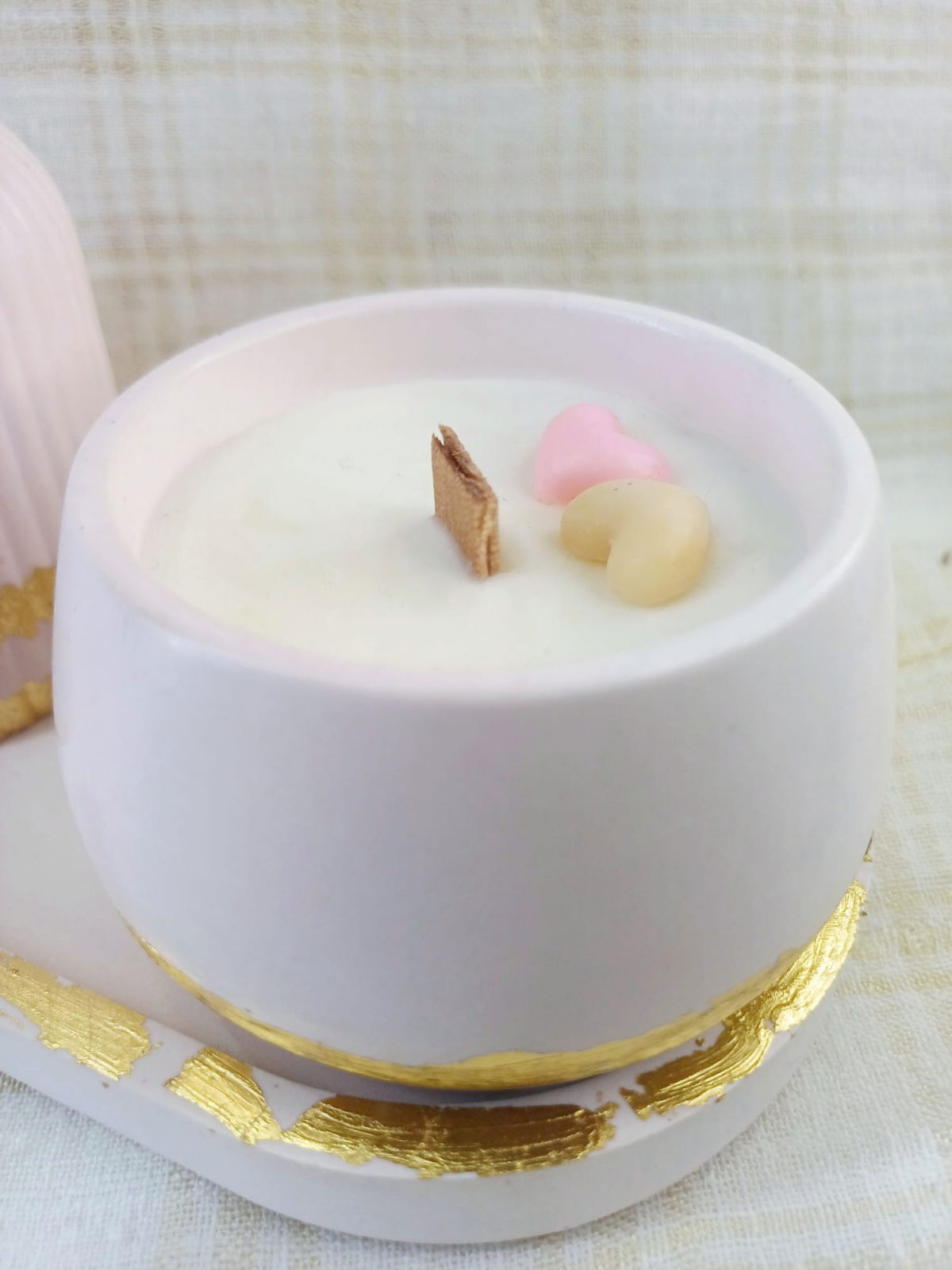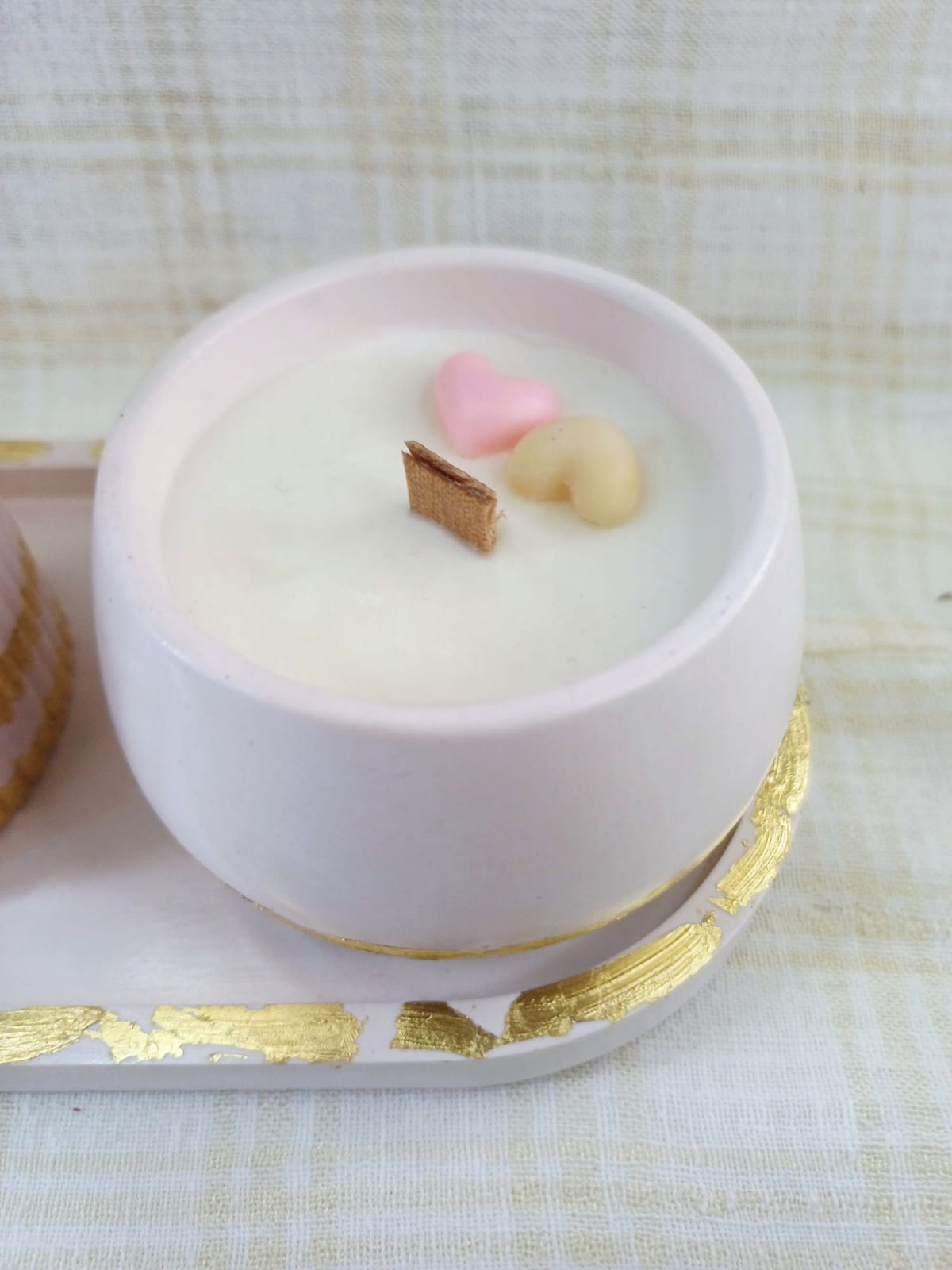 Lumanare din ceara de soia turnata intr-un bol rotund din ceramica decorata cu doua inimioare din ceara.