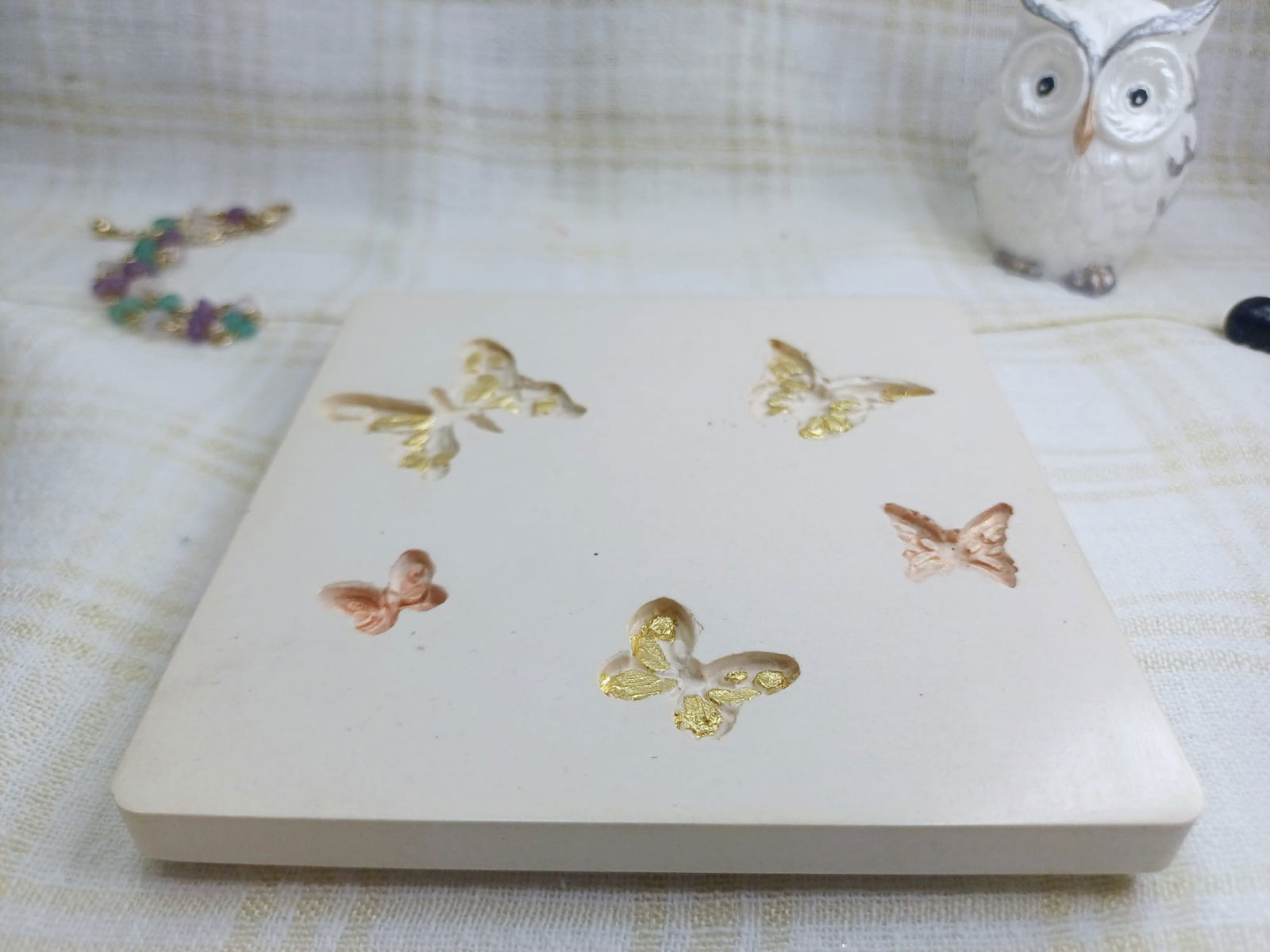 - Coaster patrat din ceramica, bej-auriu cu flutirasi imprimati in material cu multiple destinatii: suport lumanare, suport bijuterii, decor.