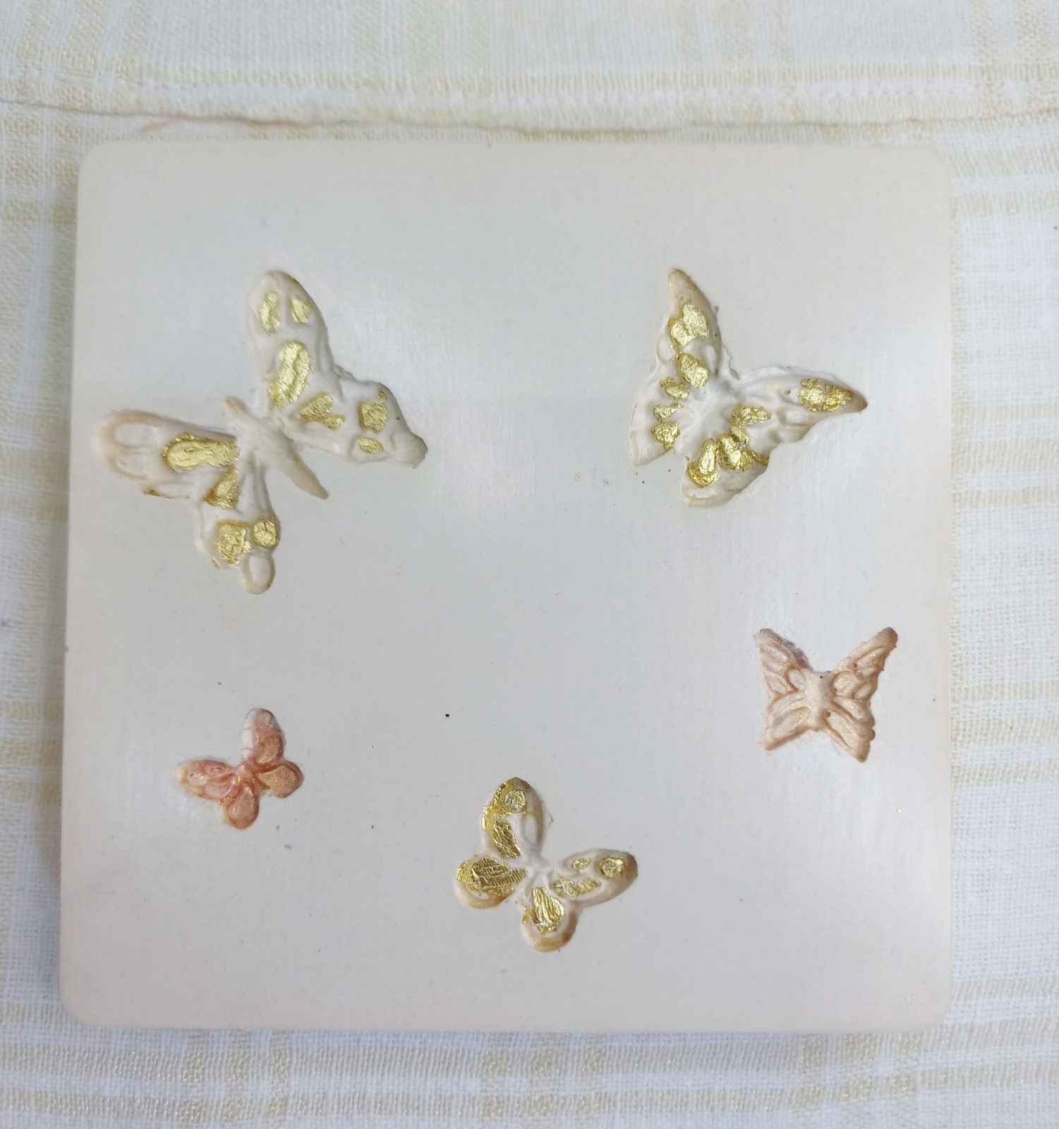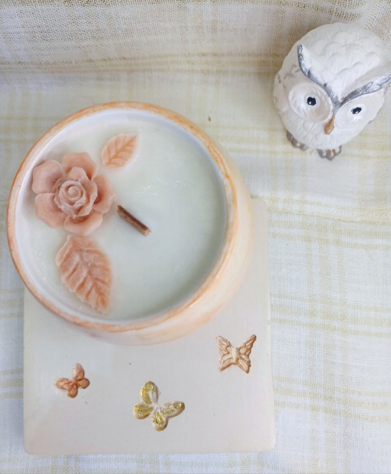 Set decorativ format dintr-un coaster din ceramica intr-o nuanta calda de bej-auriu cu fluturasi imprimati si o lumanare din ceara de soia turnata in recipient /bol rotund din ceramica intr-o nuanta blanda si catifelata de piersica. Intr-un colț delicat al camerei, acest set decorativ contribuie la crearea unei atmosfere pline de eleganță și căldură.
