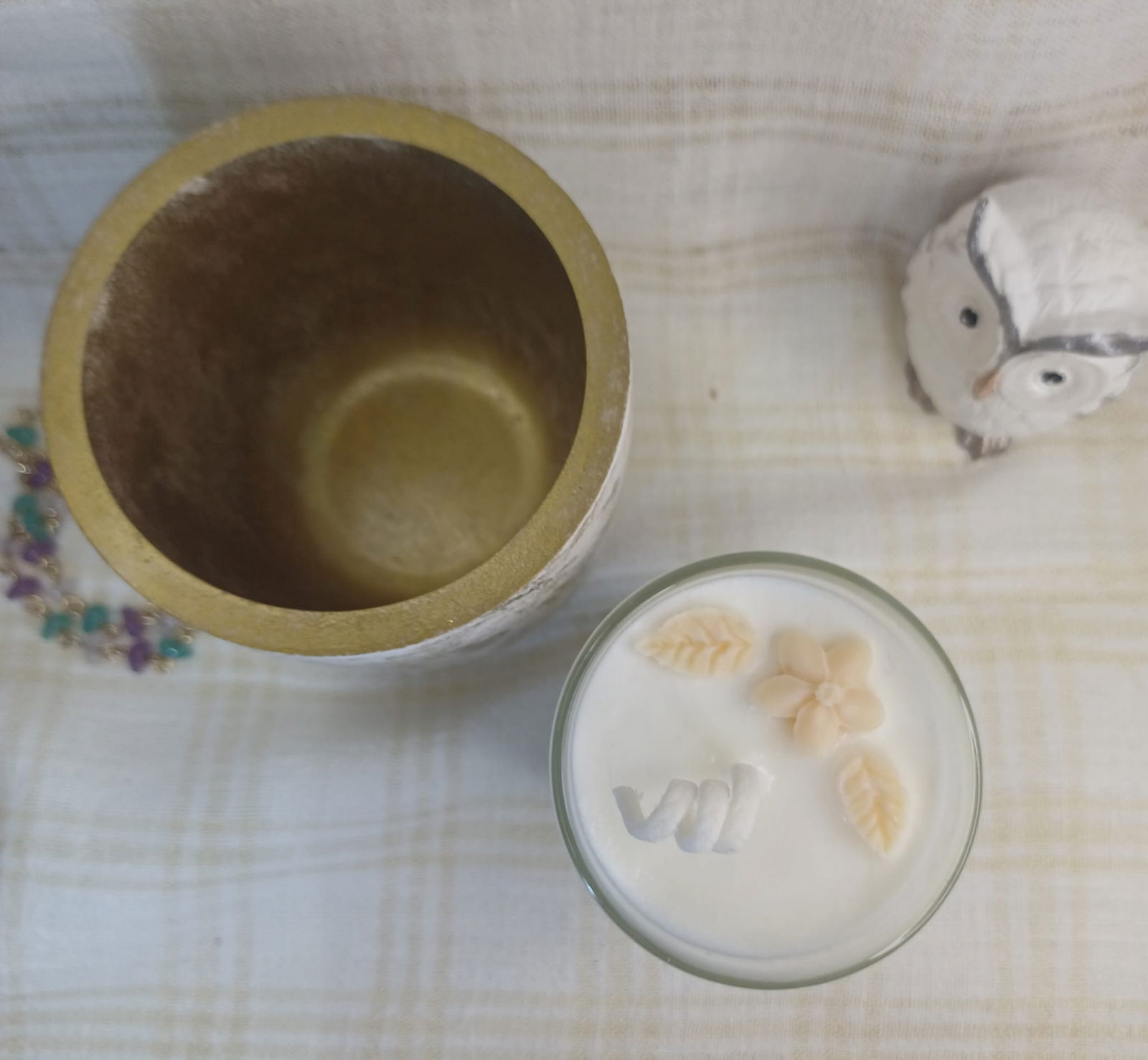 Set decorativ - lumanare in pahar de sticla si un recipient din ceramica handmade alb auriu